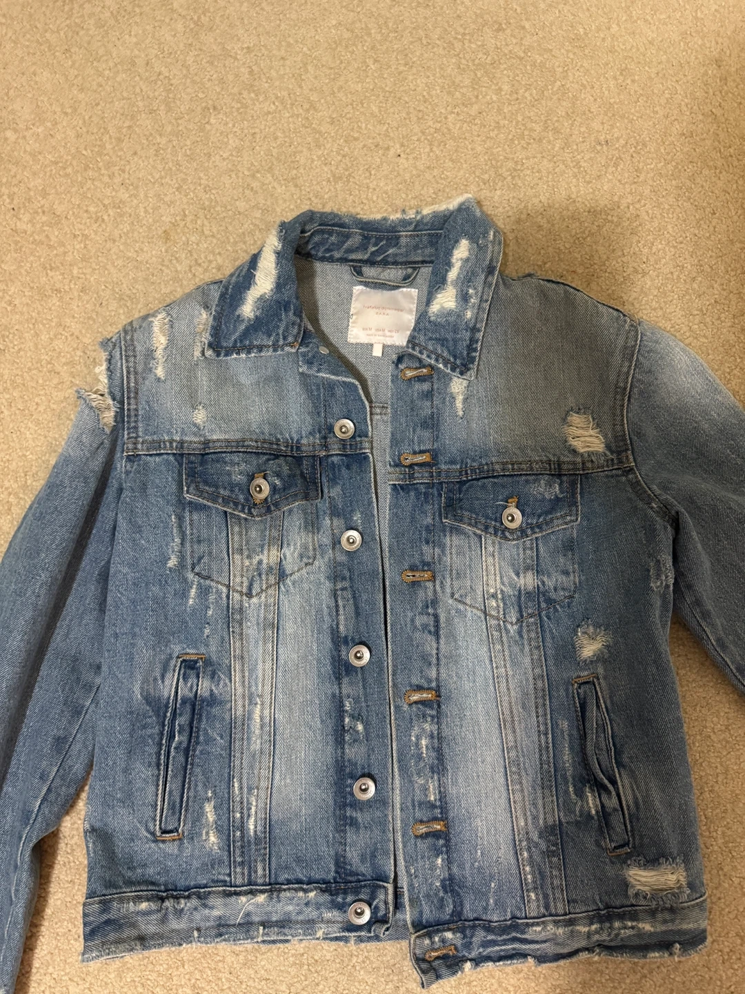 Fits for size S-M. Here's a Zara denim jacket! It's got a cool, worn-in look with intentional rips and frays. Perfect for adding a bit of edge to any outfit Pickup in Cedarbrae SW