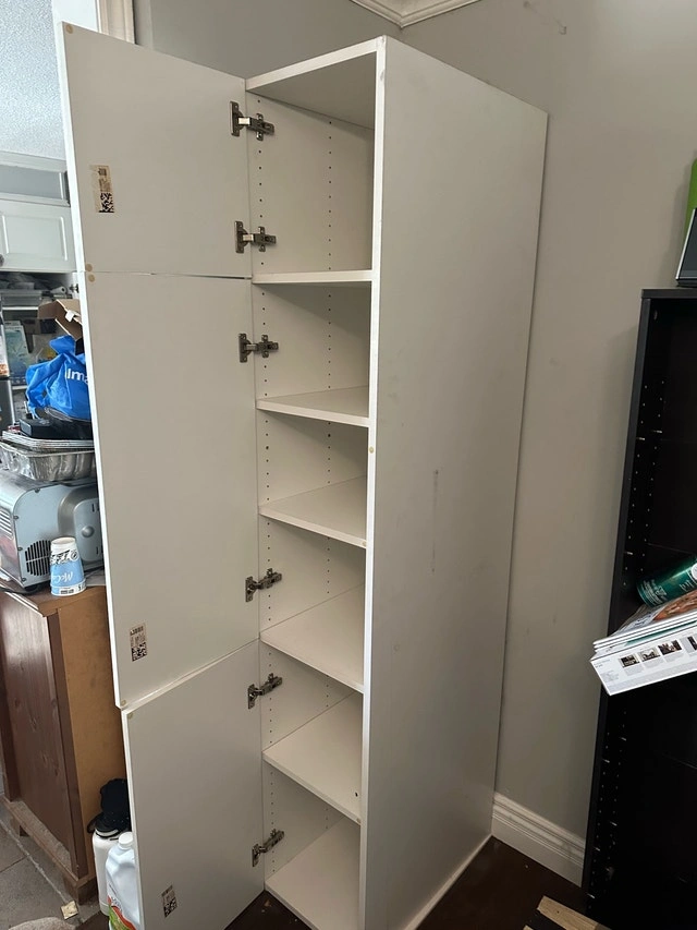 Paid $280. Total dimensions W 15” D 24” H 79.5”. Has 3 separate storage compartments. Top compartment is W 15” D 24” H 15”. Middle W 15” D 24” H 33” with 1 adjustable shelf. Bottom W 15” D 24” H 30” with 2 adjustable shelves.