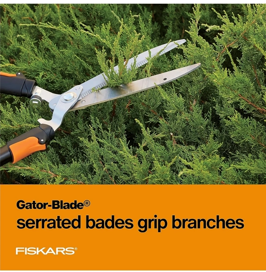 These Fiskars Power-Lever extendable hedge shears are perfect for keeping your hedges in shape! The Power-Lever technology maximizes leverage, giving you more power than non-levered tools. The Gator-Blade serrated blades grip branches for clean cuts. They also feature securely-locking extendable handles for added reach and comfort