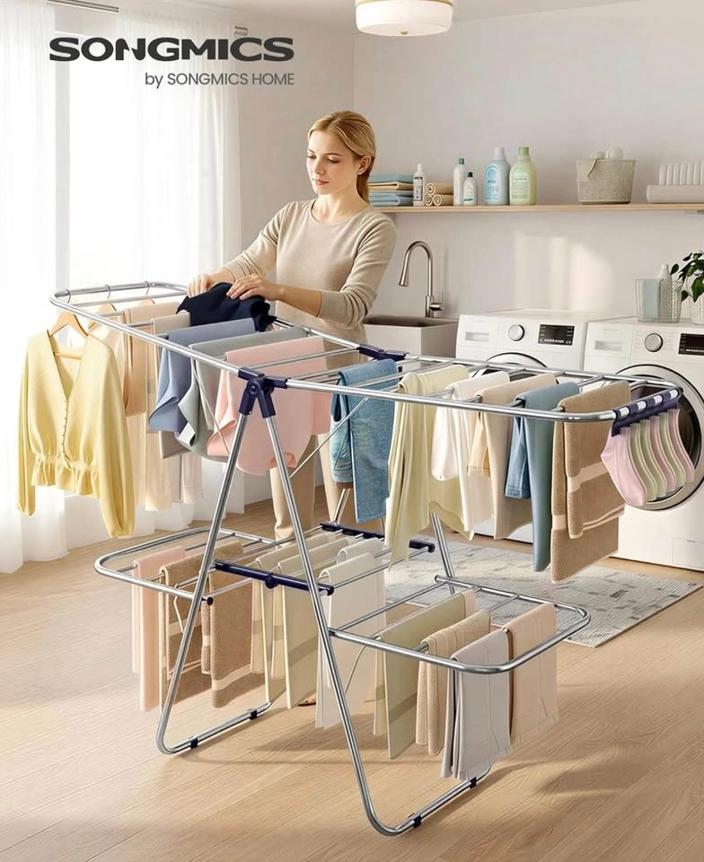 This premium SONGMICS 2-level drying rack offers 33 drying rails, sock clips, and height-adjustable wings — giving you tons of drying space without taking up your floor. Lightweight, sturdy, folds flat in seconds, and fits anywhere. Retail is around $80–$90 — grab a deal!