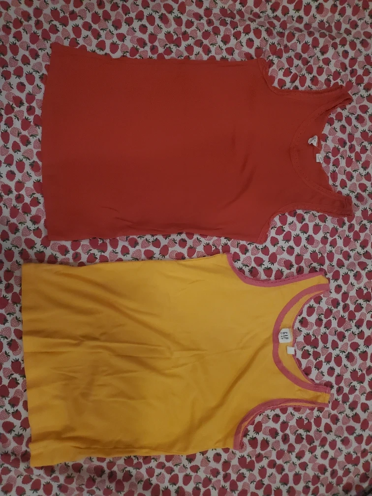 Two cute tank tops from Gap Kids! One is a red colour, and the other is orange with pink trim. Both are in great condition! Worn once