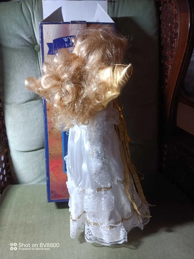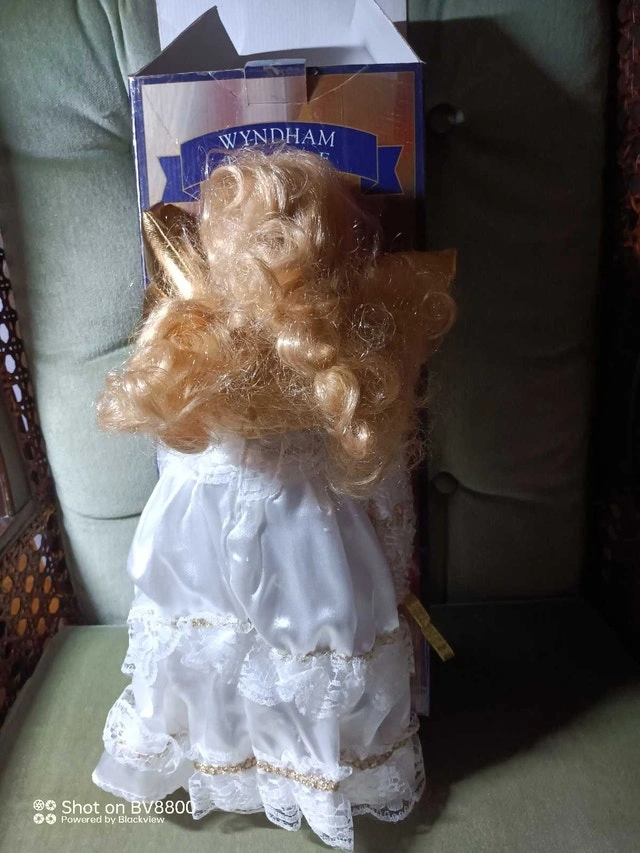 This Wyndham genuine porcelain angel collectible doll, still in its original box with certificate of authenticity, is in excellent condition. It's a beautiful piece for any doll collector or as a decorative angel. * Brand: Wyndham * Type: Porcelain Doll * Character: Angel Considering similar porcelain dolls are typically listed on Kijiji for around $30 - $60, I've priced this lovely angel doll at $50, considering its condition and included certificate. Grab this angelic friend before she flies away! If the ad is up, she's available!