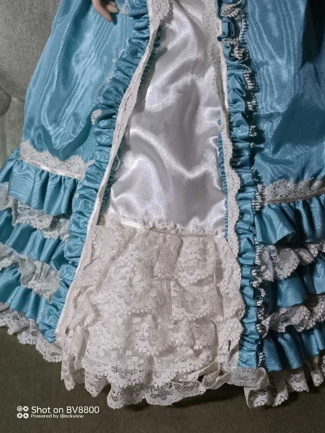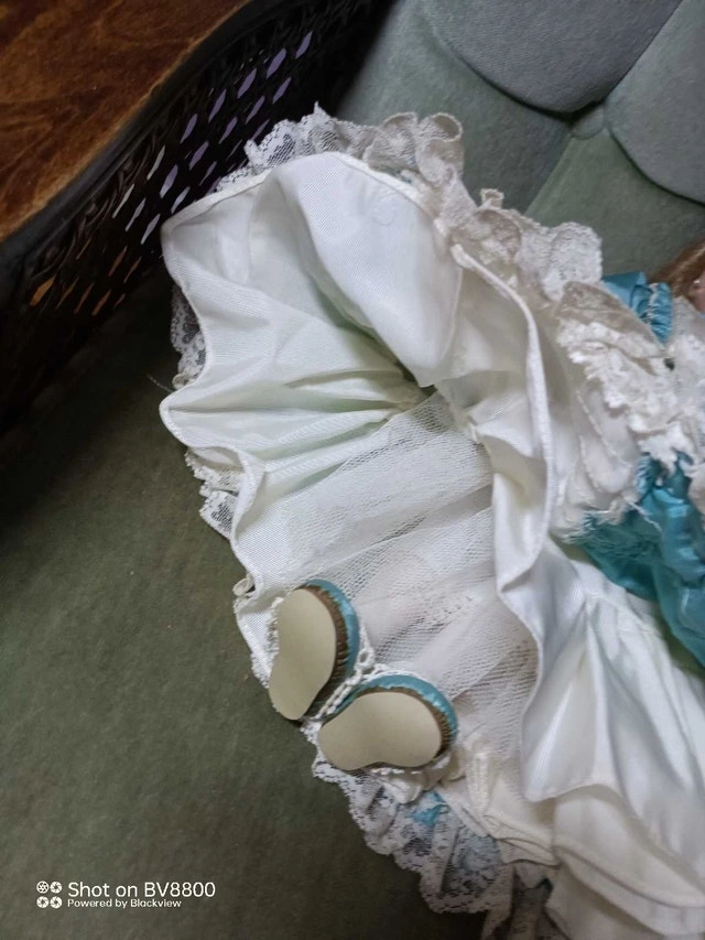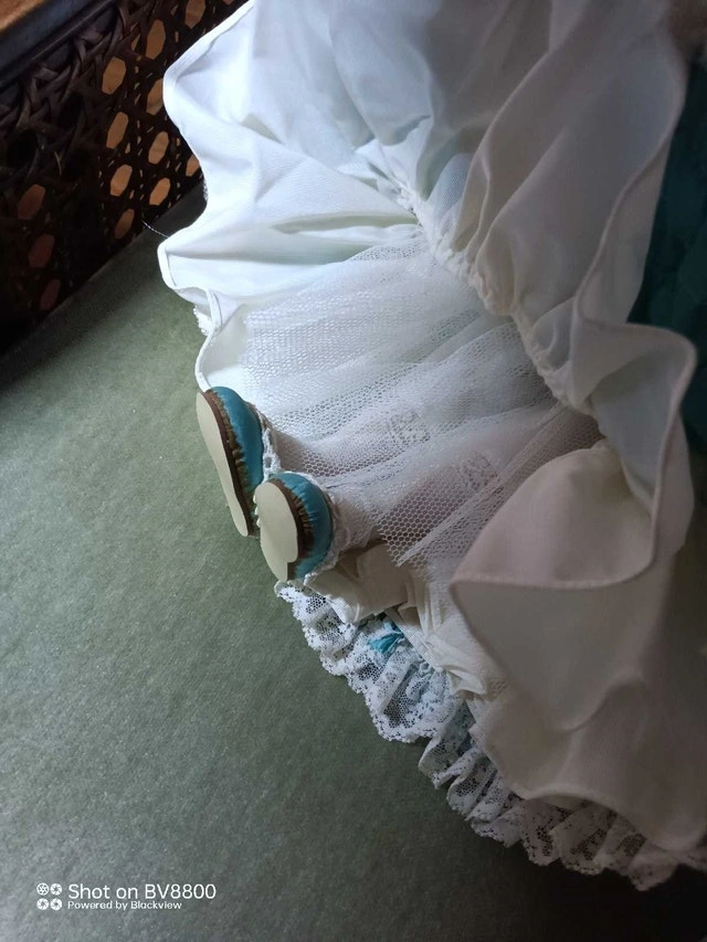 This vintage porcelain doll is in great condition, with a beautiful turquoise dress and pearl necklace. She is a charming addition to any collection and a delightful piece of decor. This doll is used, but very well cared for. * Elegant turquoise dress with lace trim * Pearl necklace and earrings * Hand-painted facial features * Ceramic hands, feet and head