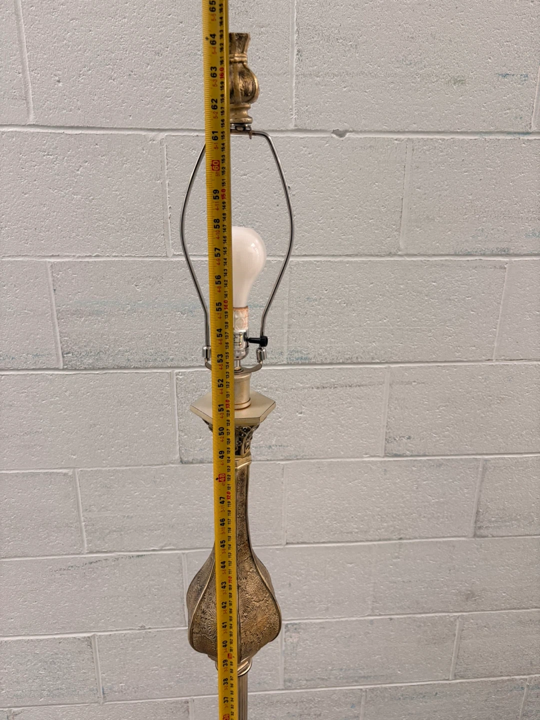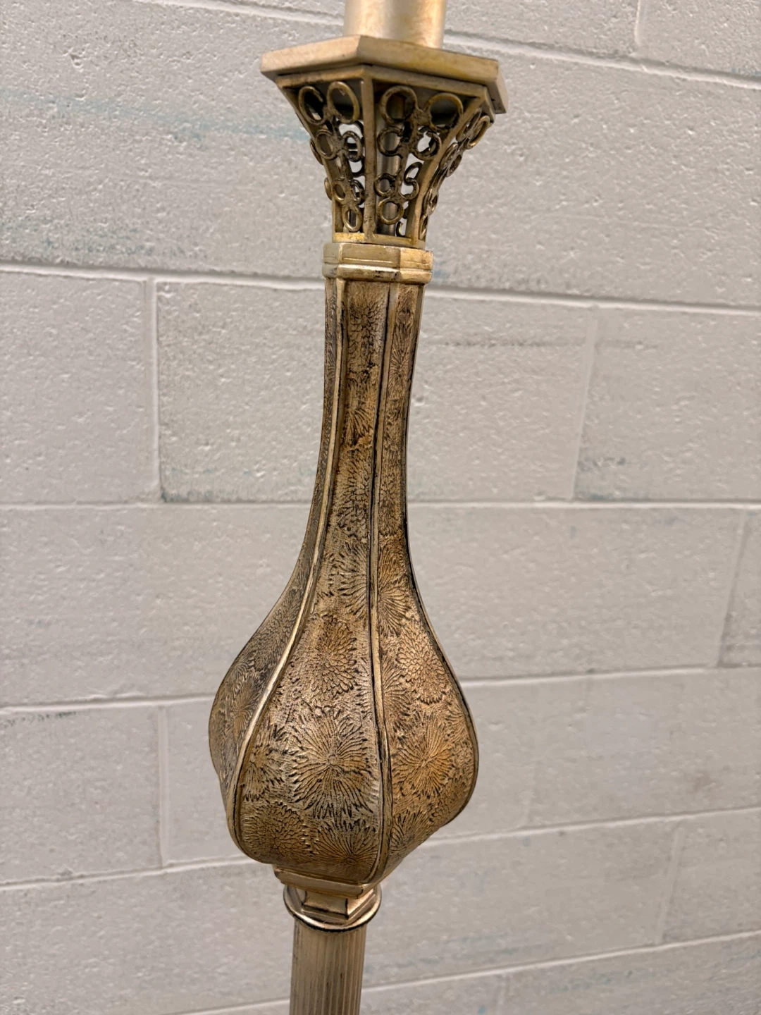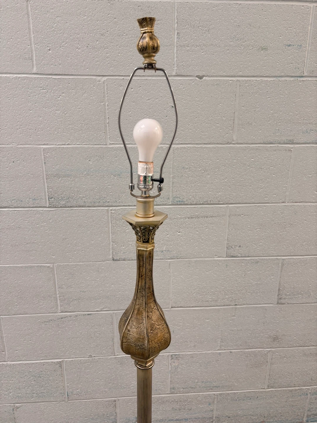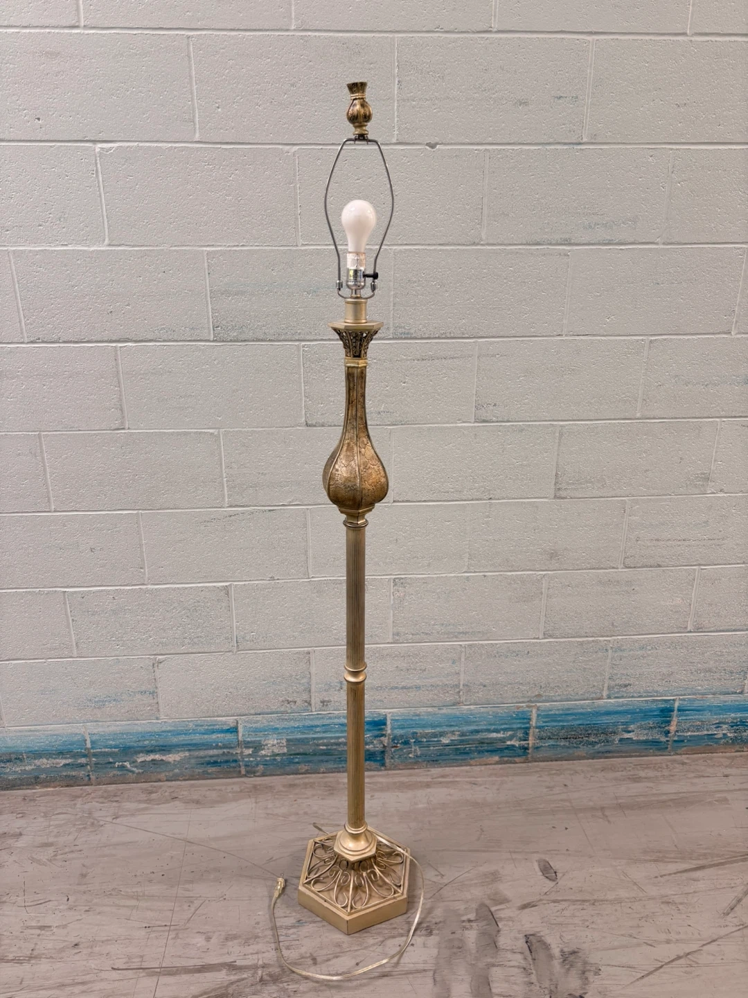 Selling a lovely antique gold floor lamp! It has a unique design with a detailed base and a decorative pattern on the body. This lamp would add a touch of elegance to any room