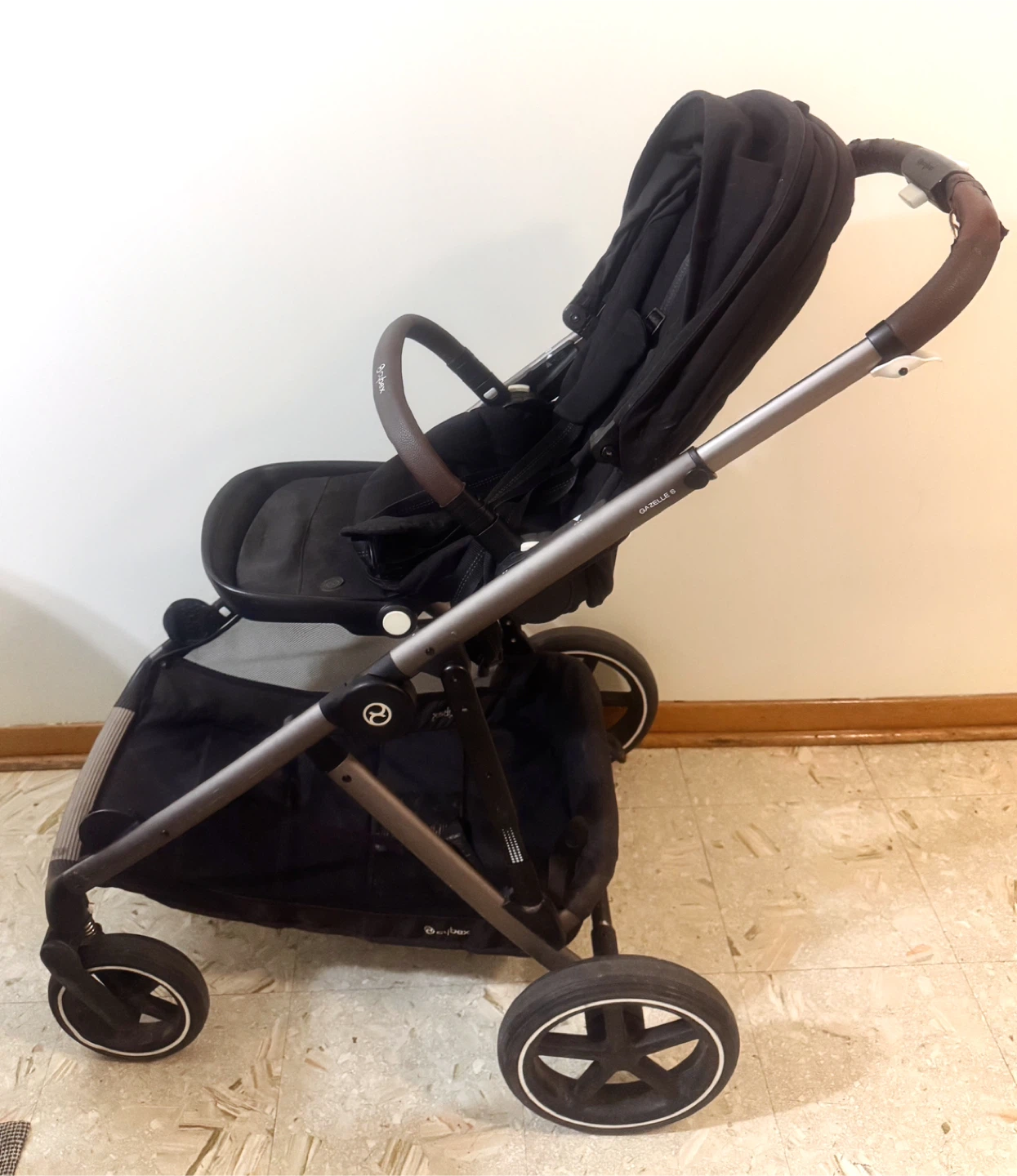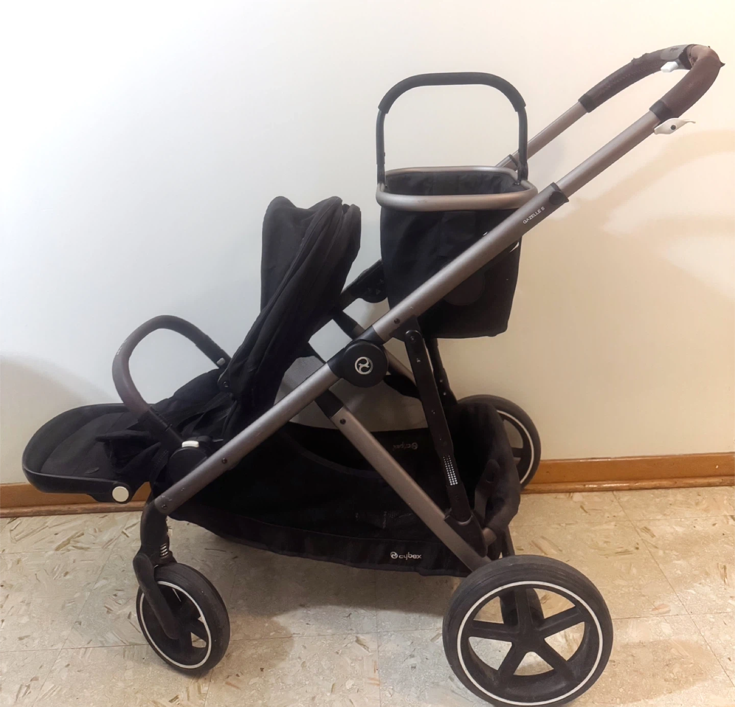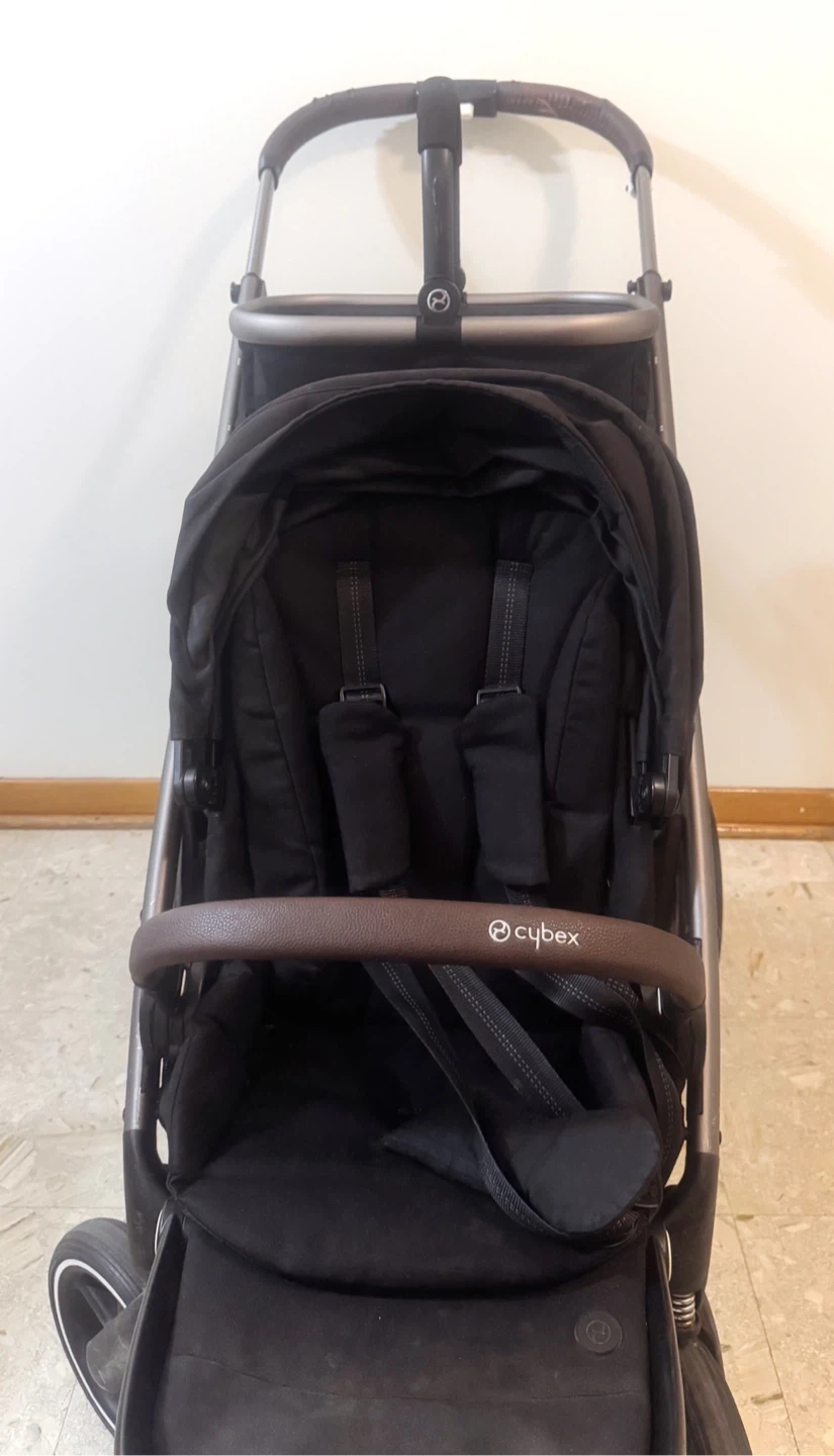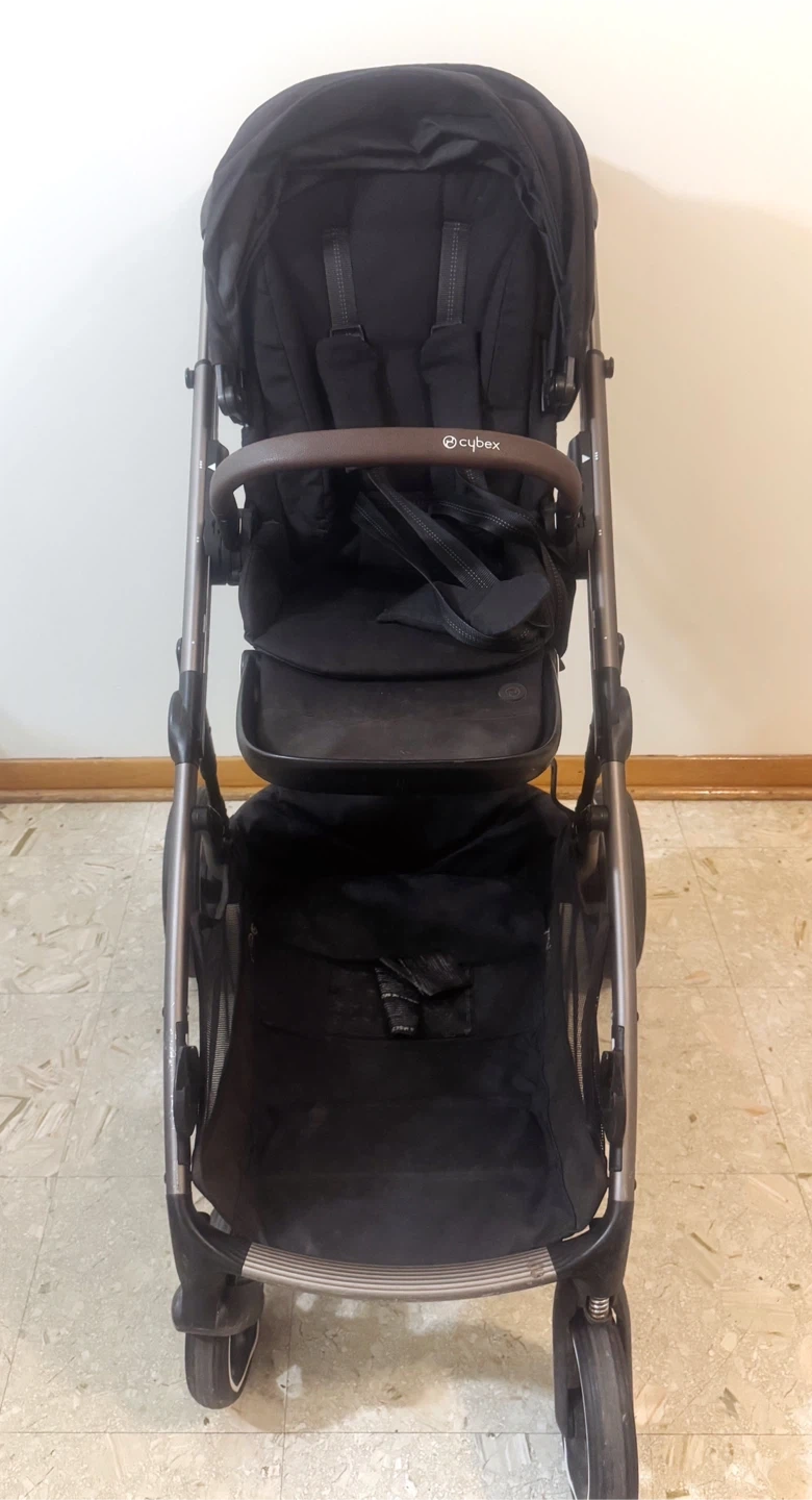 Selling a Cybex Gazelle S stroller in black. It's in great condition and ready for a new family! This stroller is super versatile and can be used in many different configurations as your child grows. It has a large storage basket underneath and a smaller removable basket above, so you'll have plenty of space for all your essentials! Plus Stroller kid board.