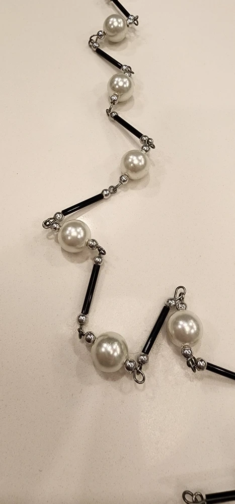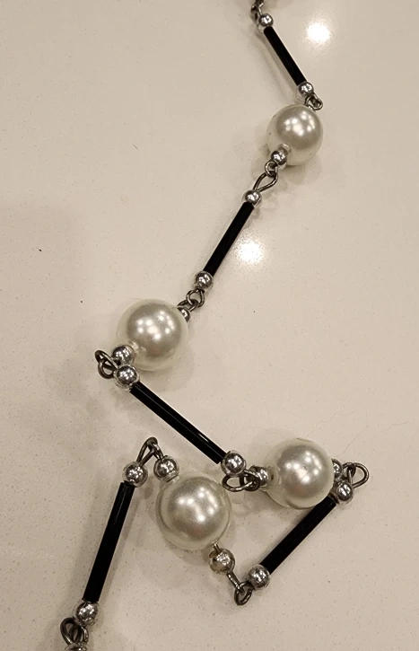 Beautiful vintage extra-long beaded necklace in great condition. Features glossy pearl-style beads paired with sleek black tube beads, giving it a classic, elegant look. At 56" long, it can be worn as a single strand, doubled, or even tripled.