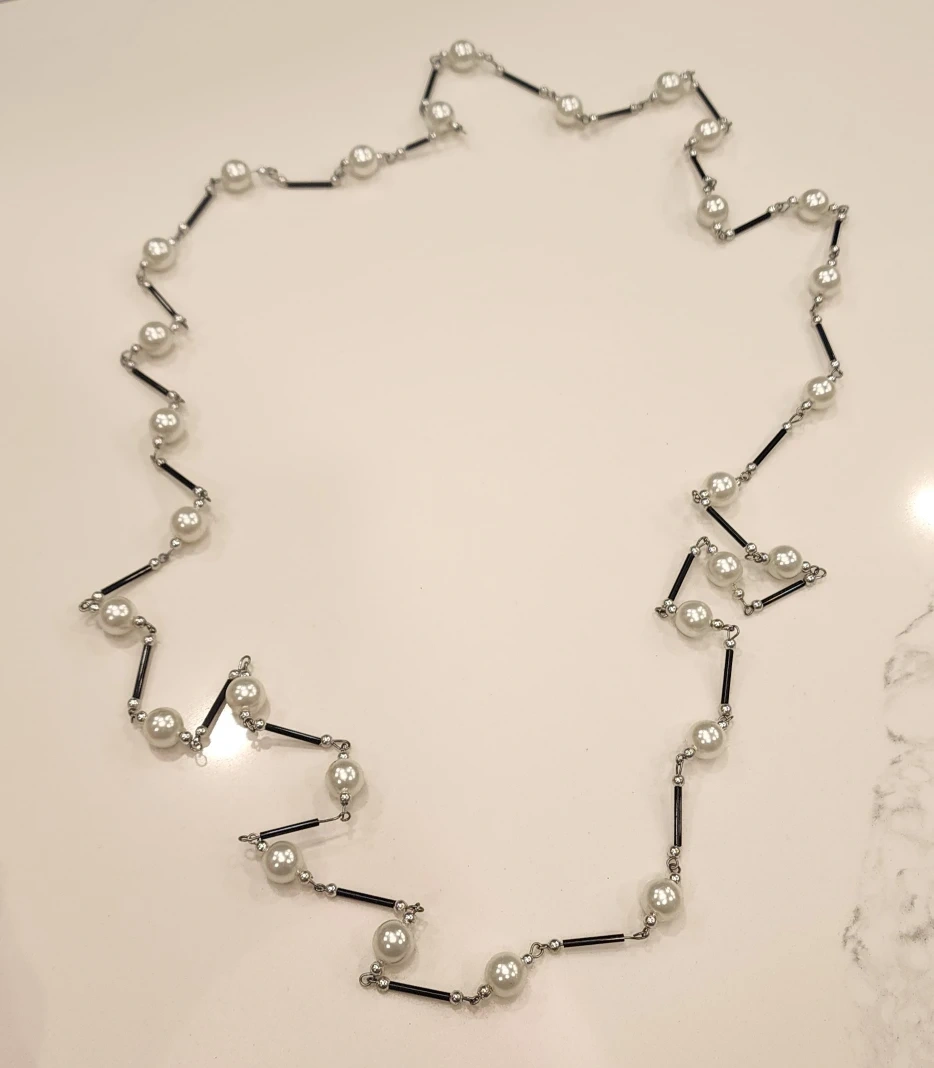 Vintage 56" Long Beaded Necklace – Pearl & Black Tube Beads