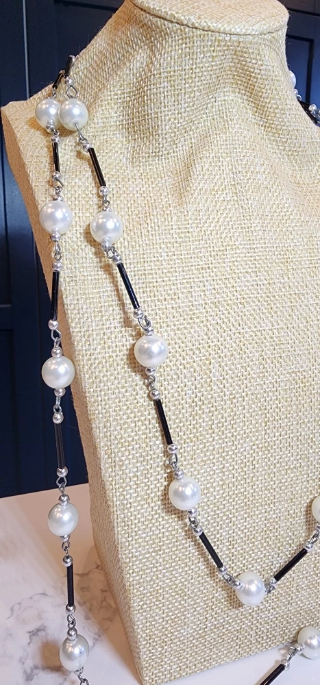 Beautiful vintage extra-long beaded necklace in great condition. Features glossy pearl-style beads paired with sleek black tube beads, giving it a classic, elegant look. At 56" long, it can be worn as a single strand, doubled, or even tripled.