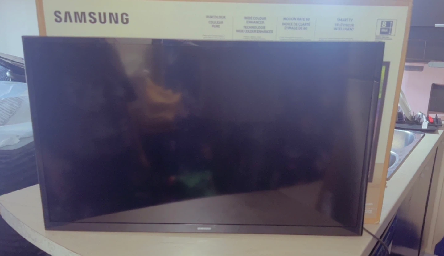 Selling a Samsung 32-inch HD TV. It's the 4 Series/Série M4500 model. It features PurColour, Wide Colour Enhancer, and Motion Rate 60. Also, it's a smart TV with a smart hub. It also has 2 HDMI ports. The box is included!