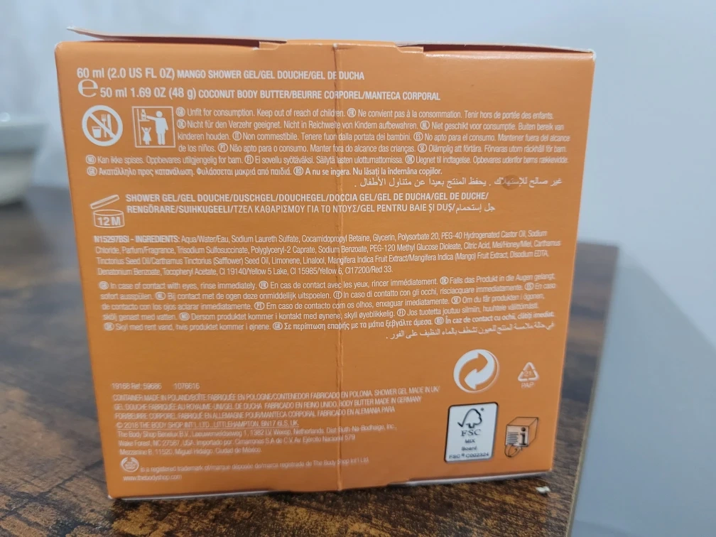 This Tropical Treats gift set from The Body Shop includes a mango shower gel and a coconut body butter! There is a dent in the box as shown on the photo, but the shower gel and body butter haven't been used before.