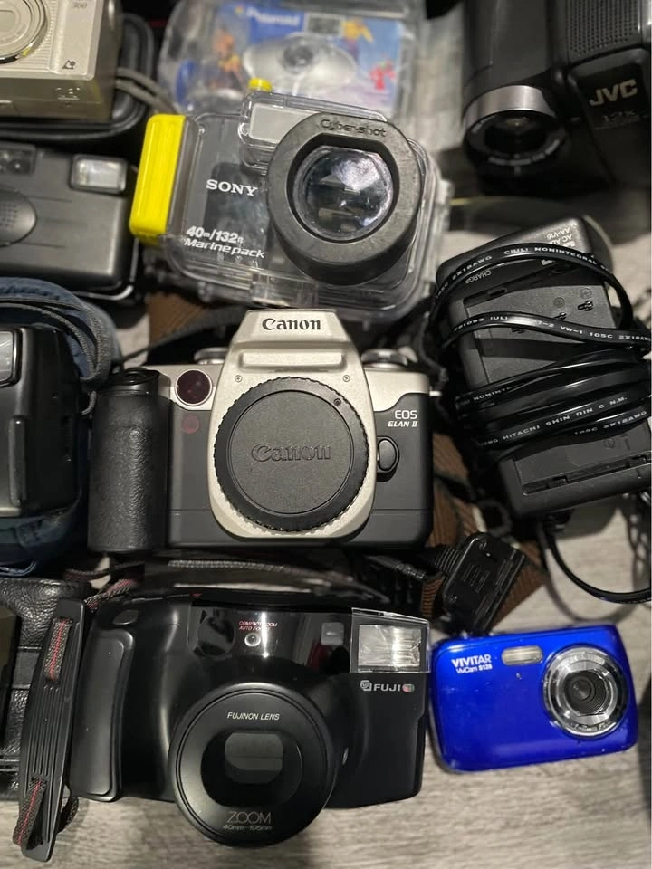 All have been tested and are in working condition! There’s a total of 19 cameras, 1 lense, 2 flashes , 1 camcorder and one underwater camera case!