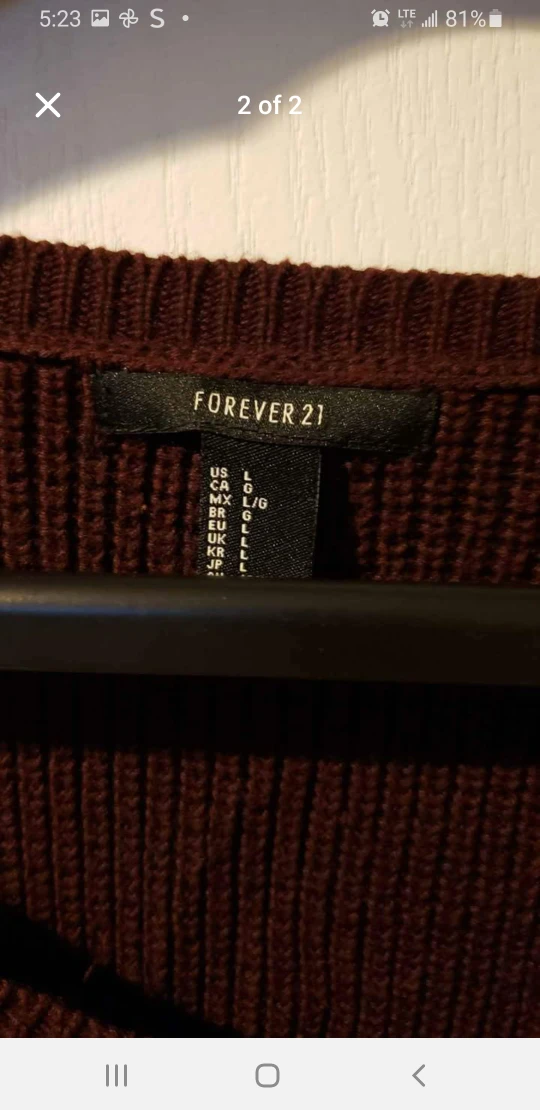 Selling a cute Forever 21 cropped sweater in a lovely burgundy colour! It's a size large and in great condition. Perfect for layering or wearing on its own for a stylish, casual look