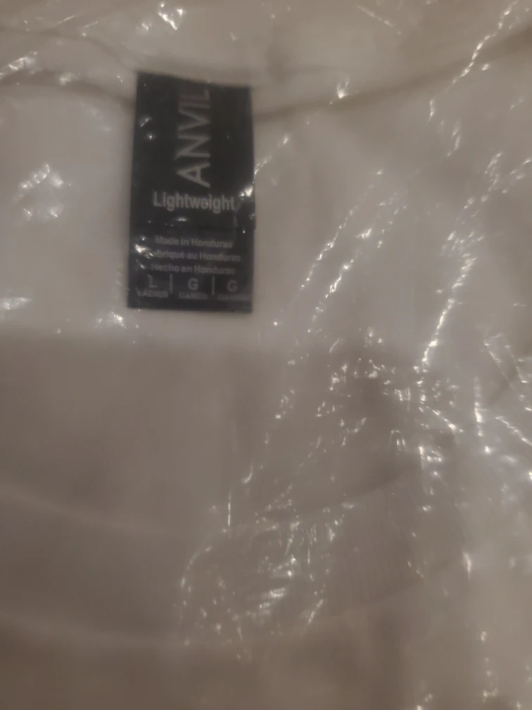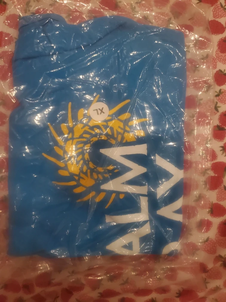 One is a blue XL t-shirt with a sun design. The other is a white L t-shirt.