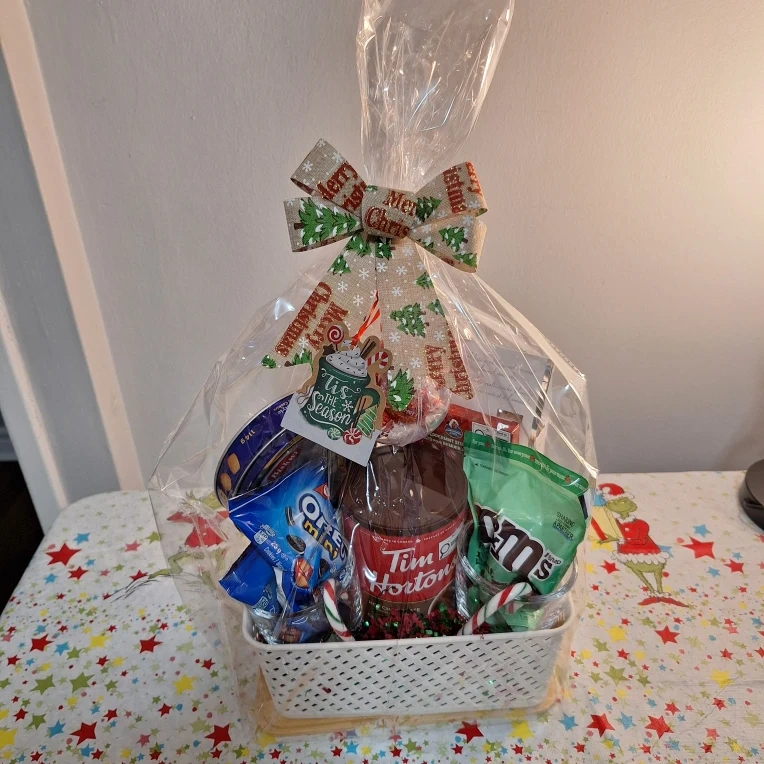 I'm selling a holiday gift basket filled with goodies for the season! It includes Tim Hortons hot chocolate, Raffaello chocolates, M&M's Holiday Mint candies, Oreo Mini cookies, peppermint stir sticks, marshmallows, and Biskiw cookies, all arranged in a festive basket. Perfect for a cozy treat!