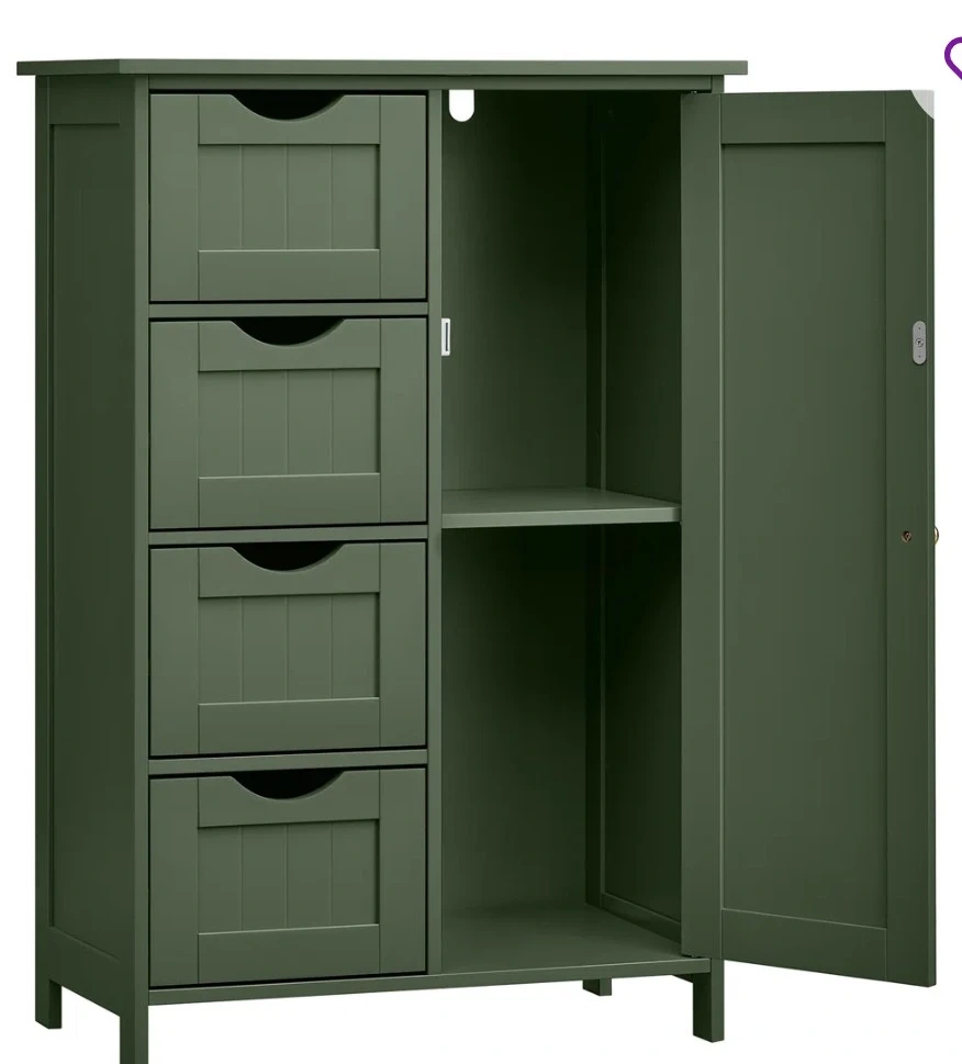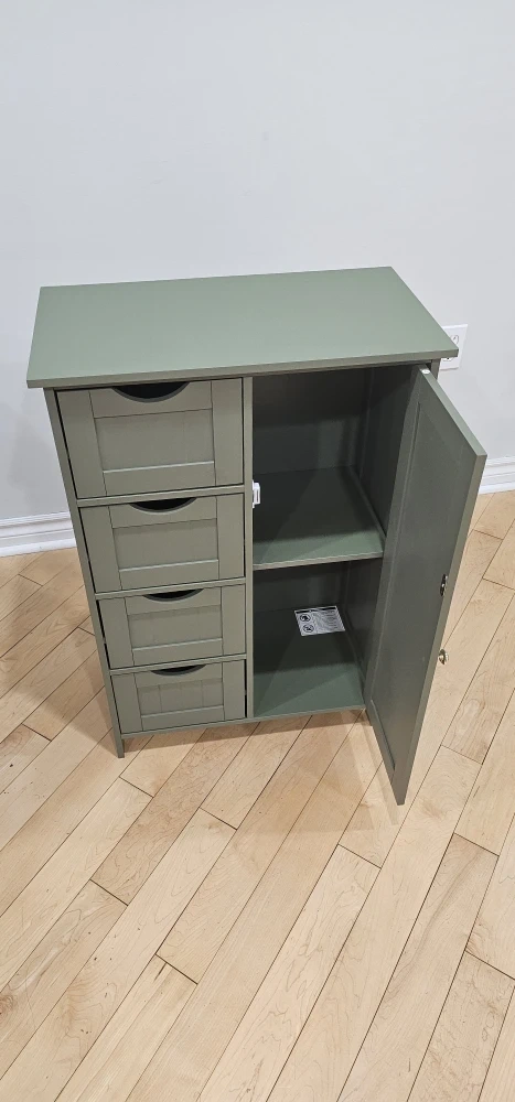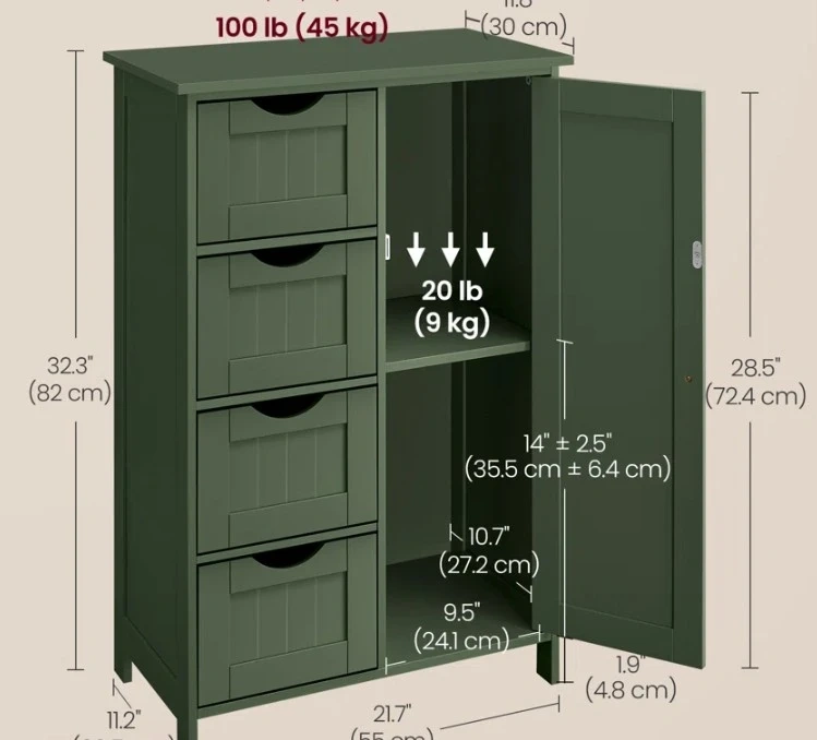 Here's a cabinet with drawers, perfect for extra storage! It's a nice green colour and has four drawers on one side and a cabinet on the other. The dimensions are approximately 32.3" (82 cm) tall, 21.7" (55 cm) wide, and 11.8" (30 cm) deep