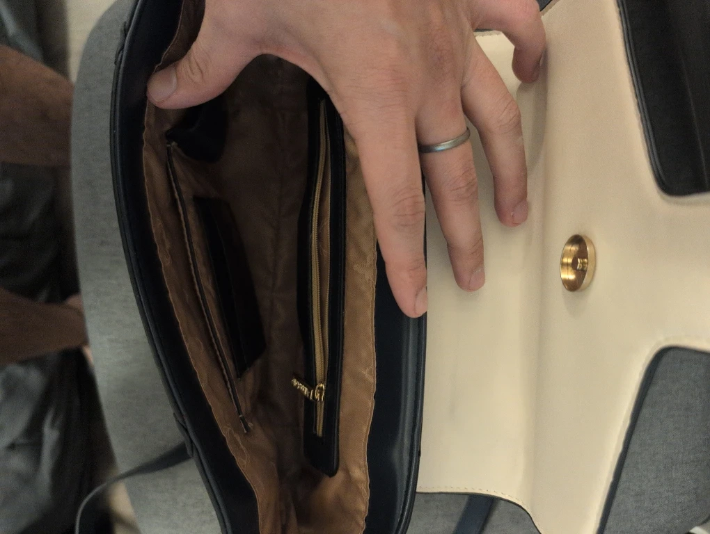 Here's a stylish Allen Solly handbag in a colour block design! It features a combination of navy, burgundy, and cream colours. Perfect for adding a pop of colour to your outfit!!