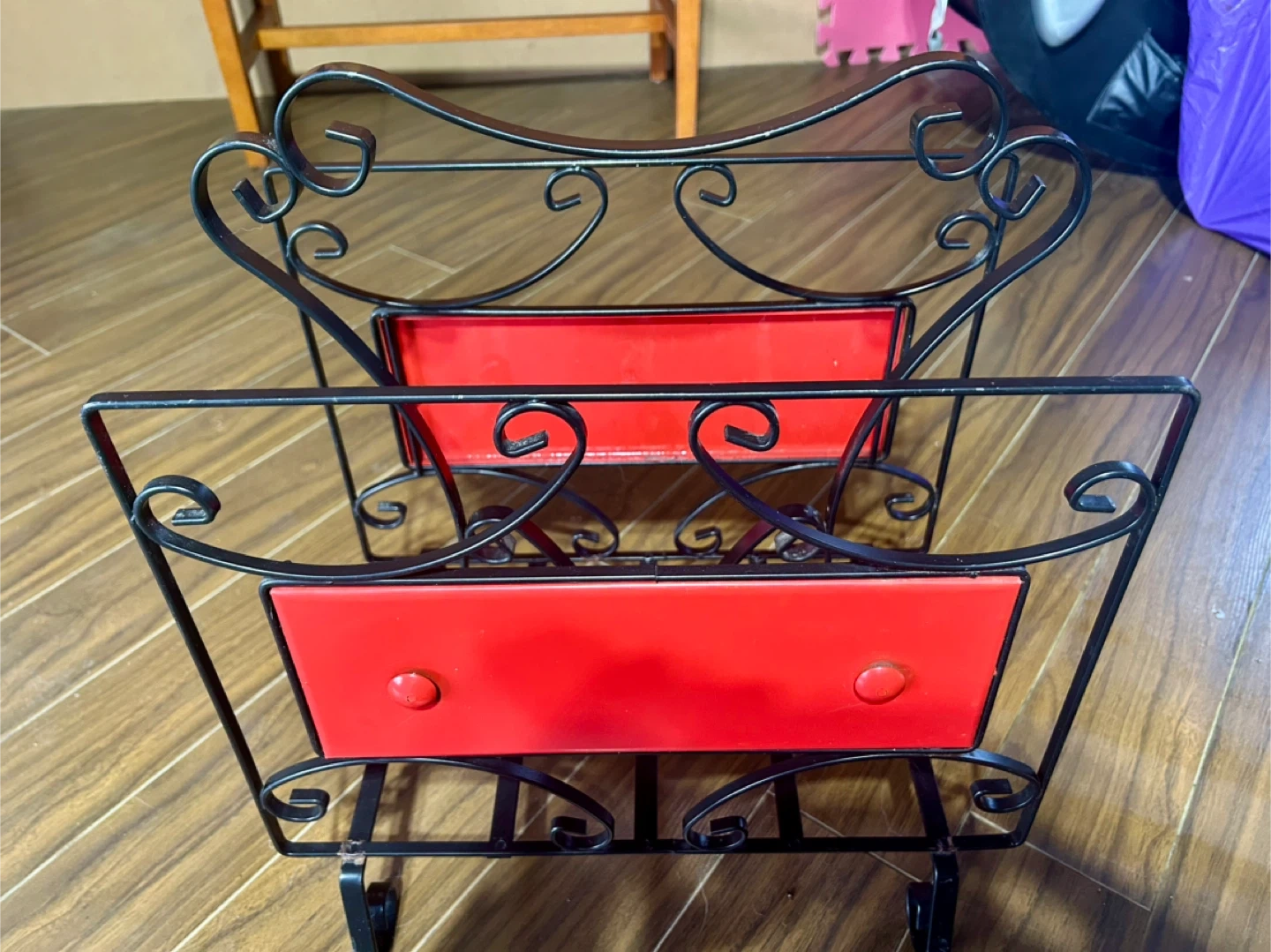 Add a touch of vintage charm to your living space with this black metal magazine rack featuring vibrant red accents! Its sturdy construction and eye-catching design make it perfect for organizing your favourite magazines and newspapers, while adding a pop of colour to any room. This item is used, showing some signs of wear consistent with age, which only adds to its unique character. If the ad is up, it's still available!