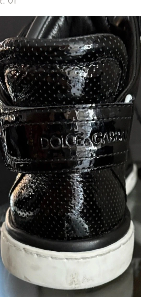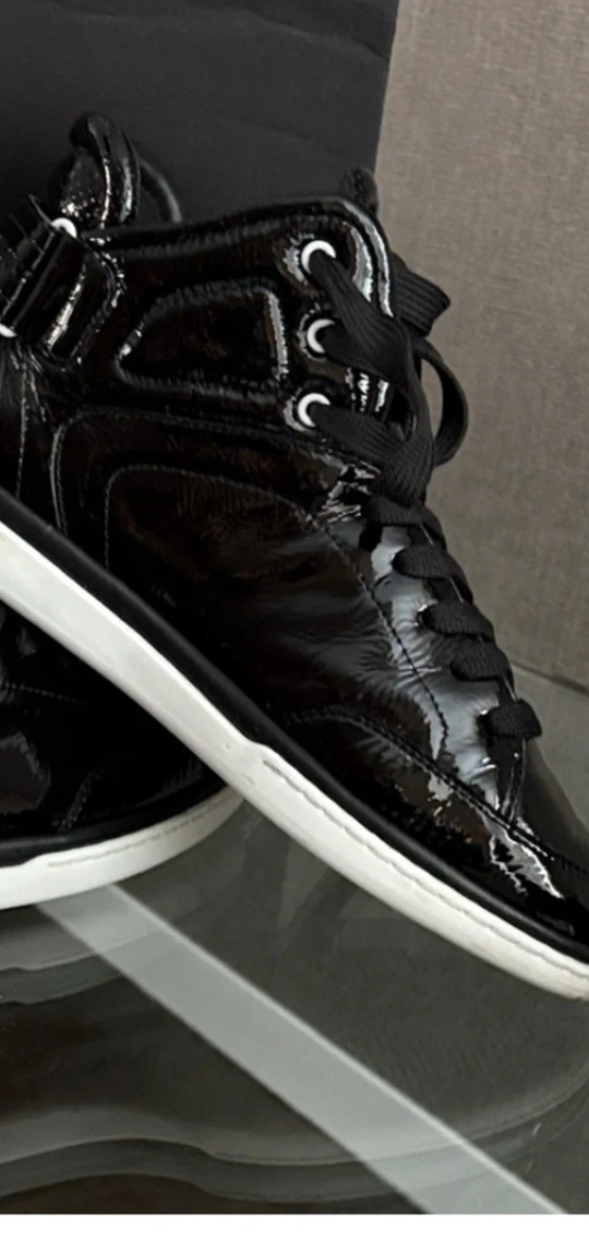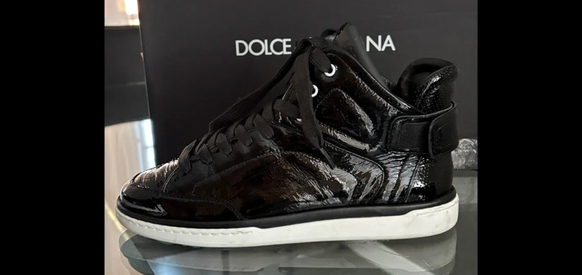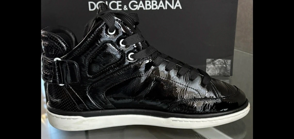 These Dolce & Gabbana high-top sneakers are a stylish addition to any wardrobe! They feature a sleek black patent leather finish with a classic lace-up design and white soles. The box is included!