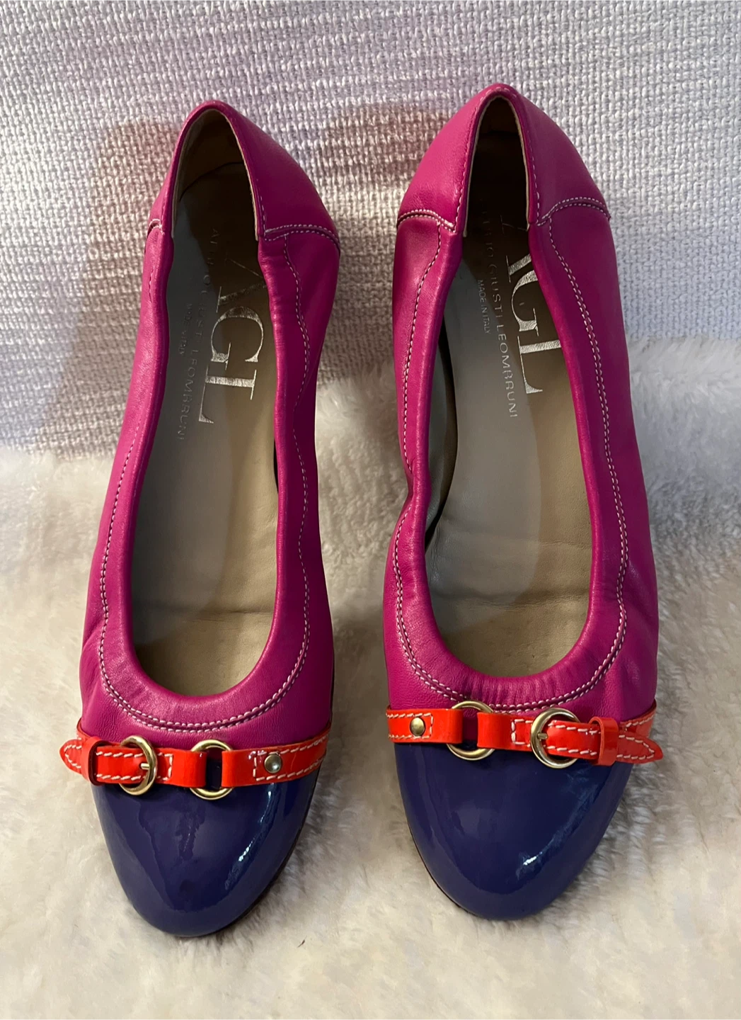 AGL Attilio Giusti Leombruni ballet leather flats in a fun colour combination of pink and blue, with a cute orange strap detail