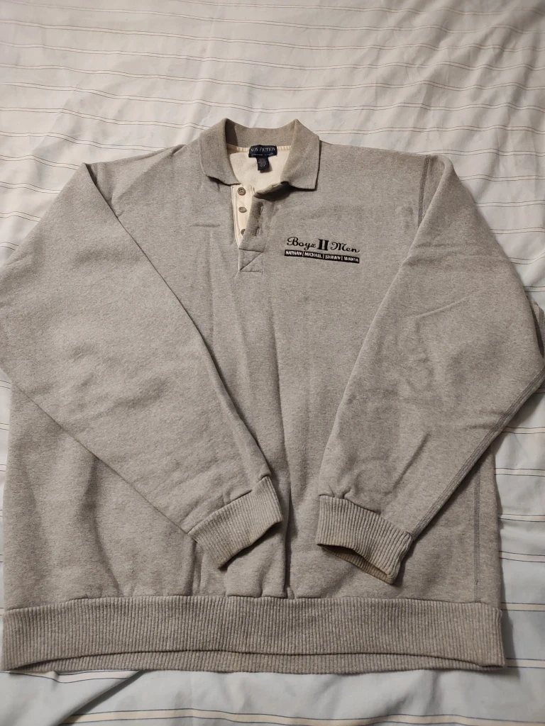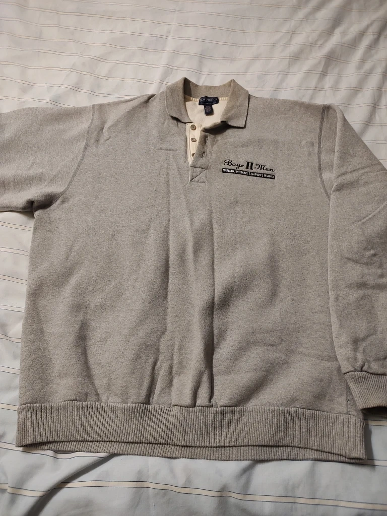 The grey sweatshirt is branded with "Boys II Men" logo.