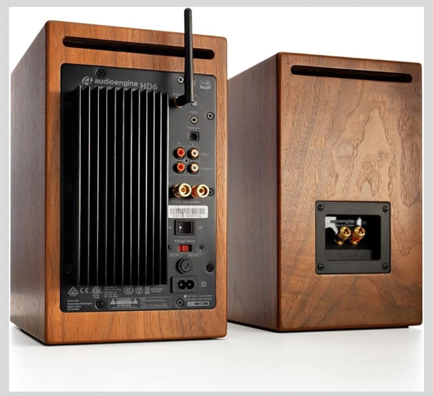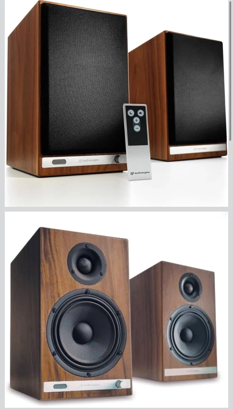 Selling a pair of Audioengine HD6 wireless speakers! These speakers are in great exterior condition and come with a remote. They feature a beautiful walnut finish.
