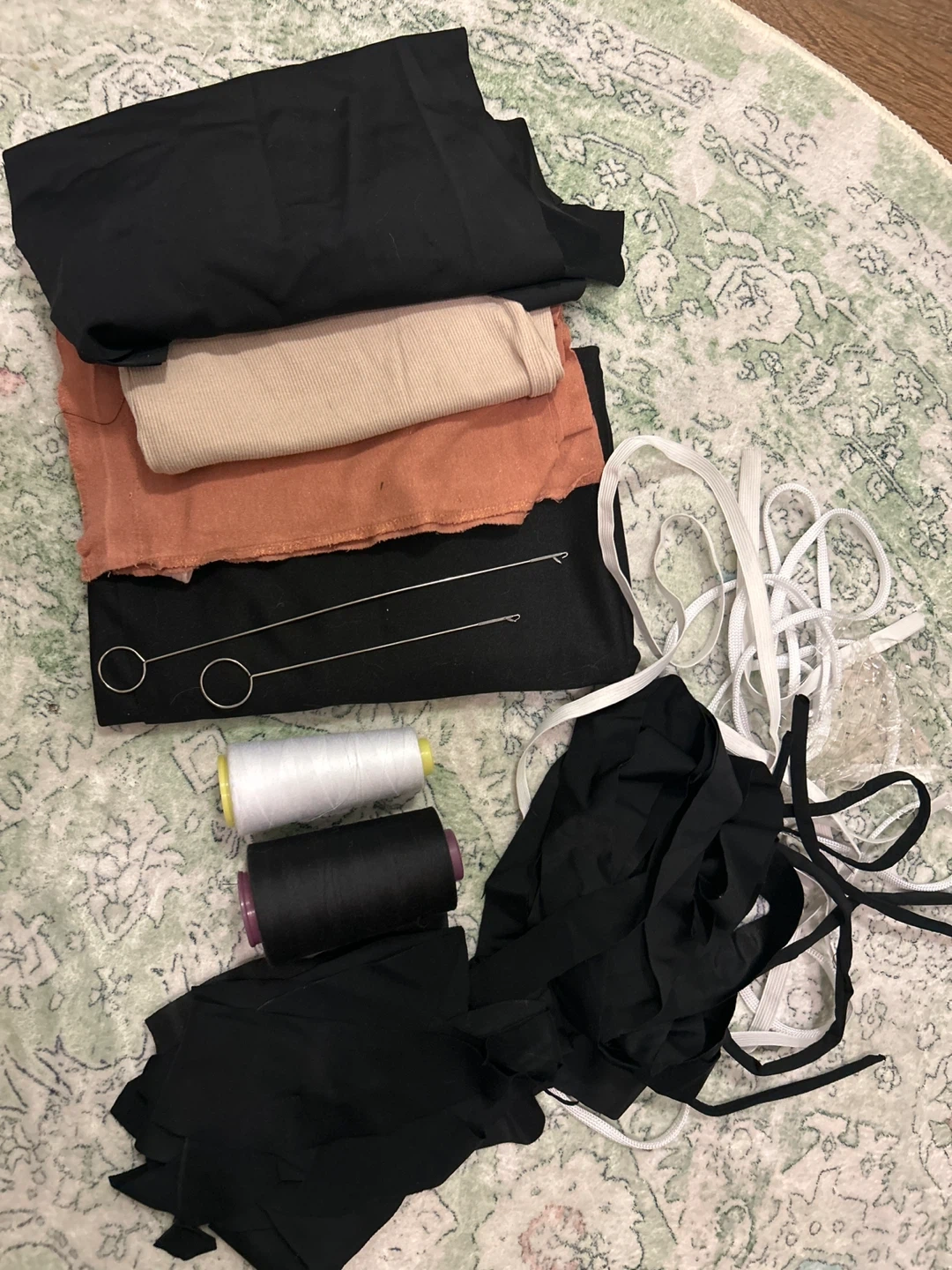 Selling a collection of sewing supplies. Includes fabric pieces in black, beige, and rust colours, along with spools of black and white thread. Also includes elastic and tools for sewing projects. Great for getting started!