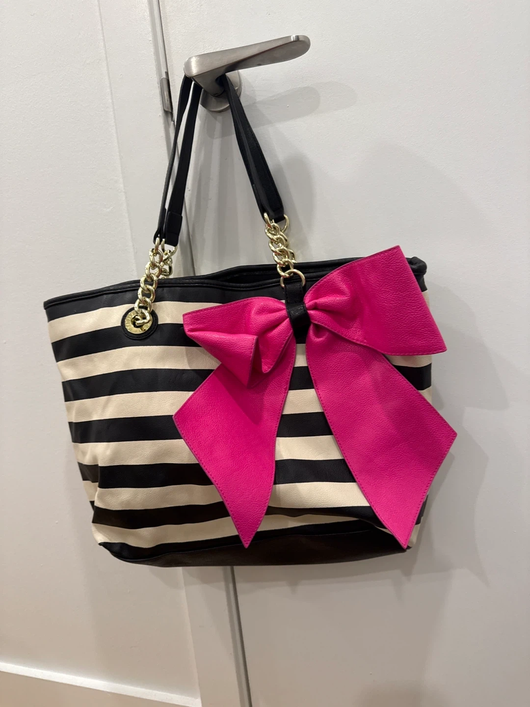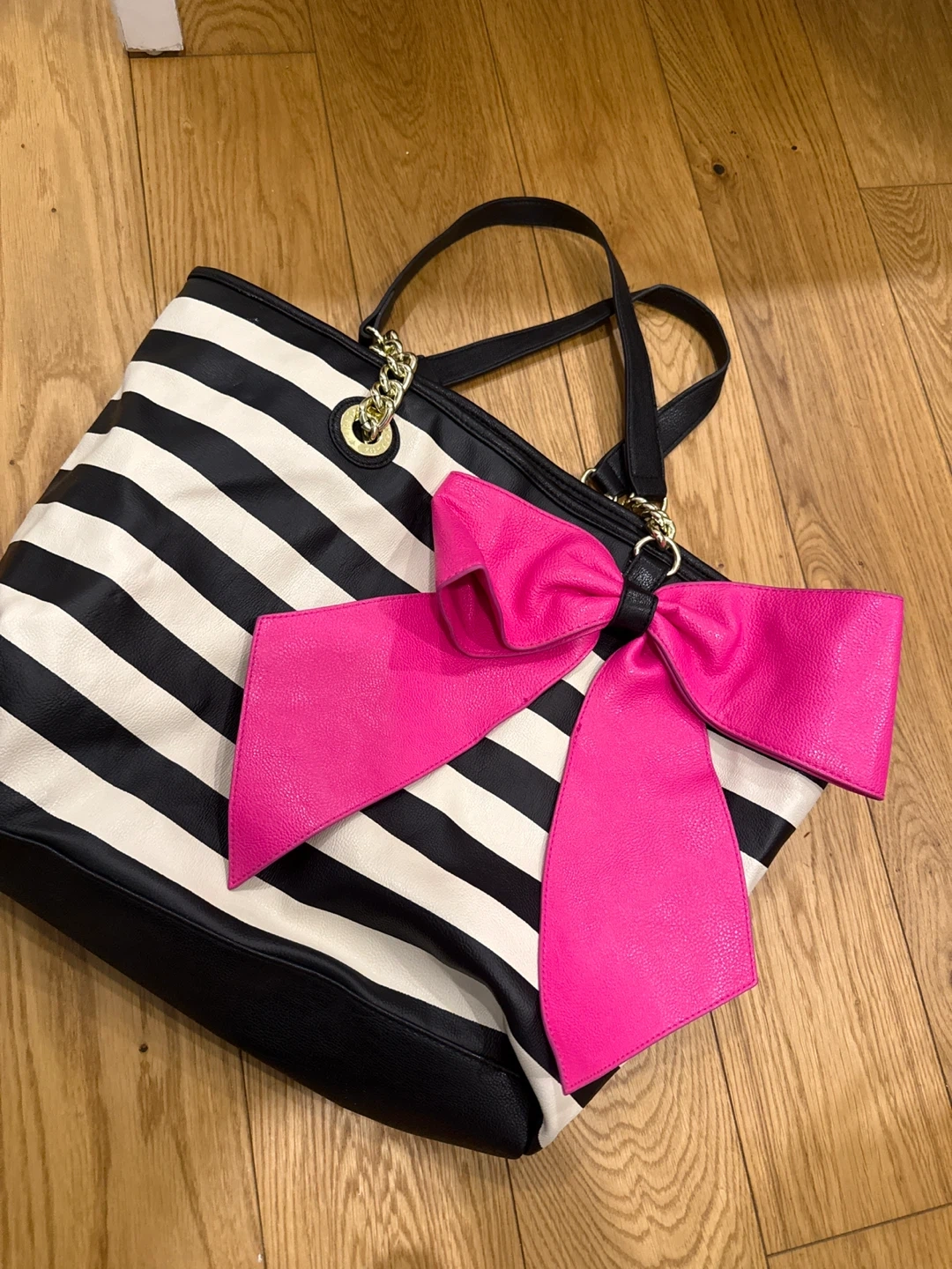 This Betsey Johnson tote is in great condition! It features a black and white striped pattern with a fun pink bow. The interior has a black lining with a rose pattern. Perfect for carrying all your essentials