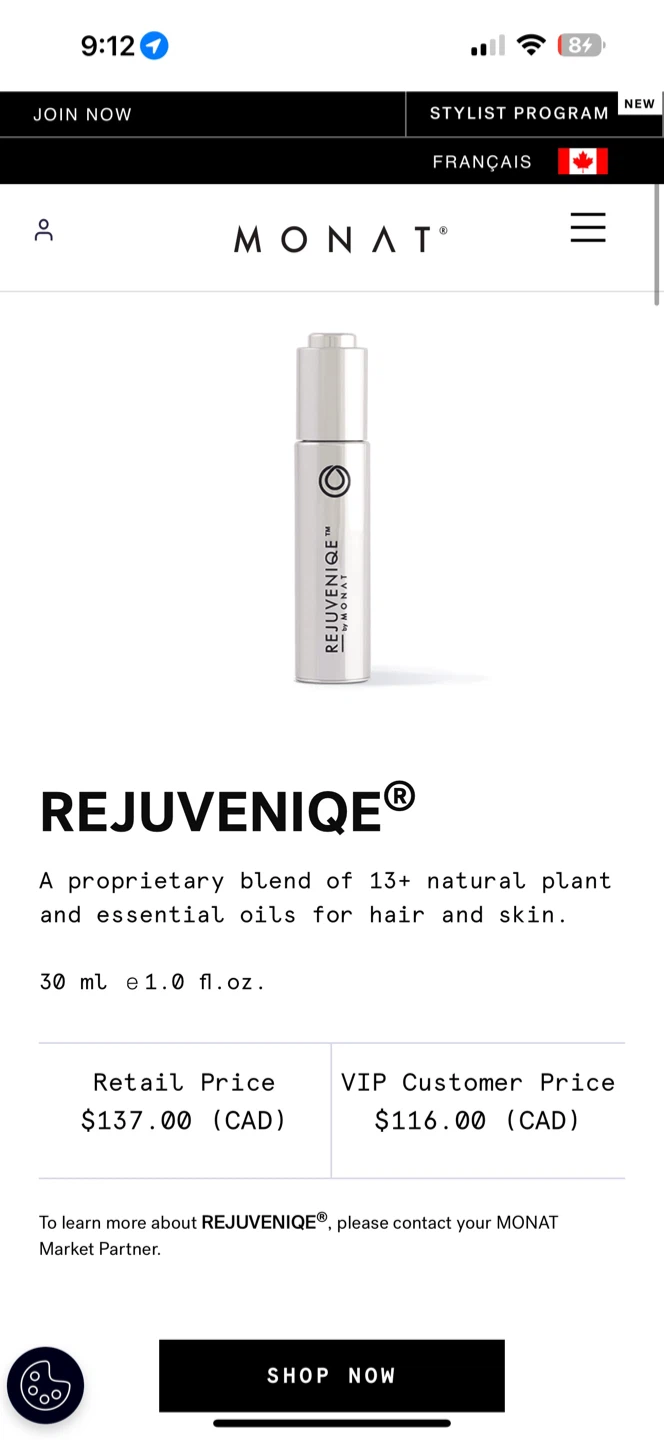 Selling a bottle of Monat Rejuveniqe Oil Intensive. This is a proprietary blend of 13+ natural plant and essential oils for hair and skin. It comes in a 30 ml (1 fl oz) bottle. Retails for $137 CAD