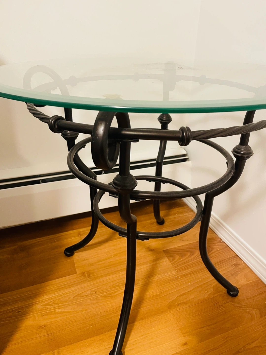 Selling a round side table with a glass top. It features a dark metal base with a unique, decorative design. This table would be a good addition to any living room or bedroom!