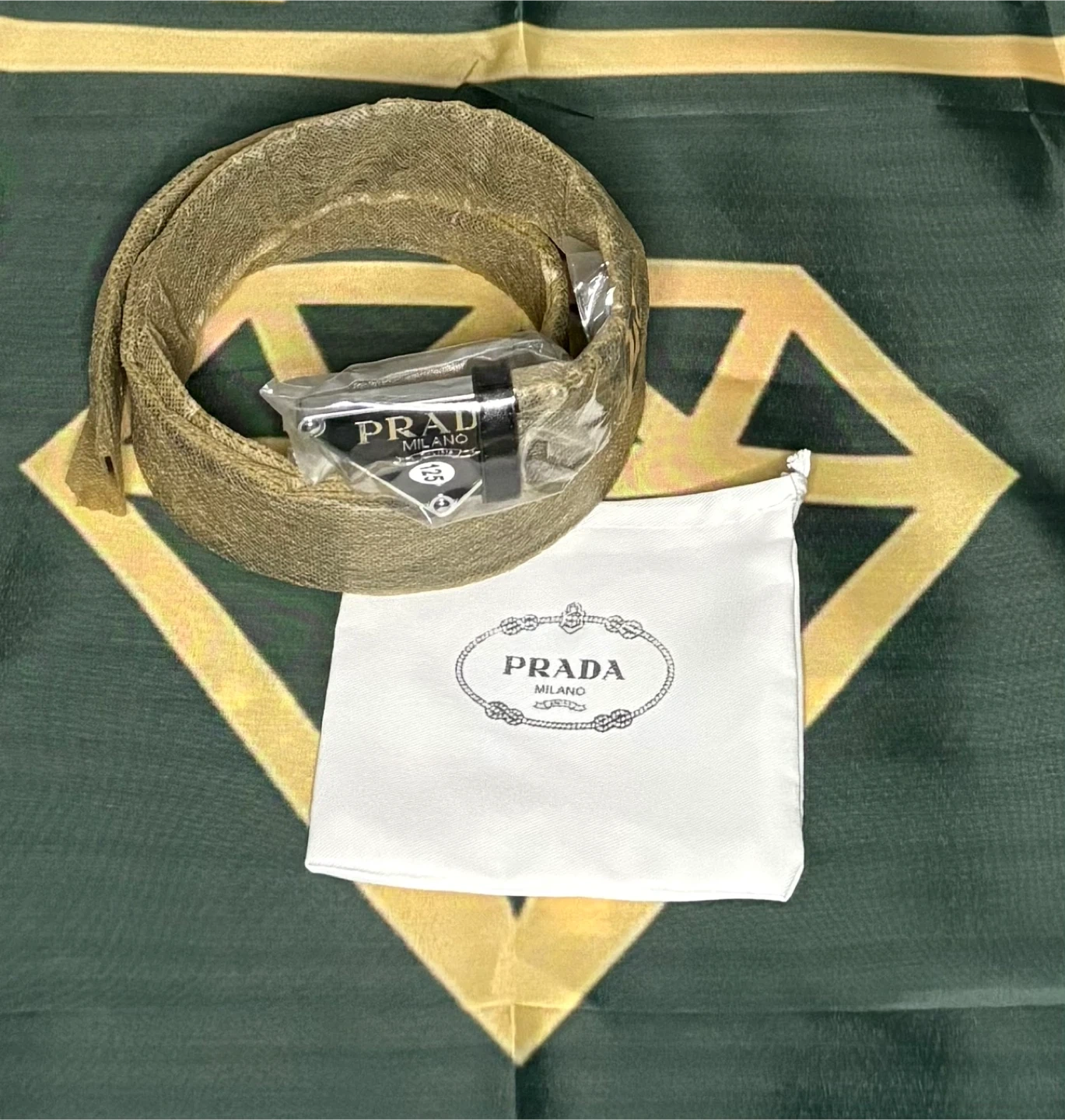 Selling a Prada belt in silver, size M. It comes with the original box and dust bag. The material is a beautiful woven metallic that catches the light. Perfect for adding a touch of luxury to any outfit!