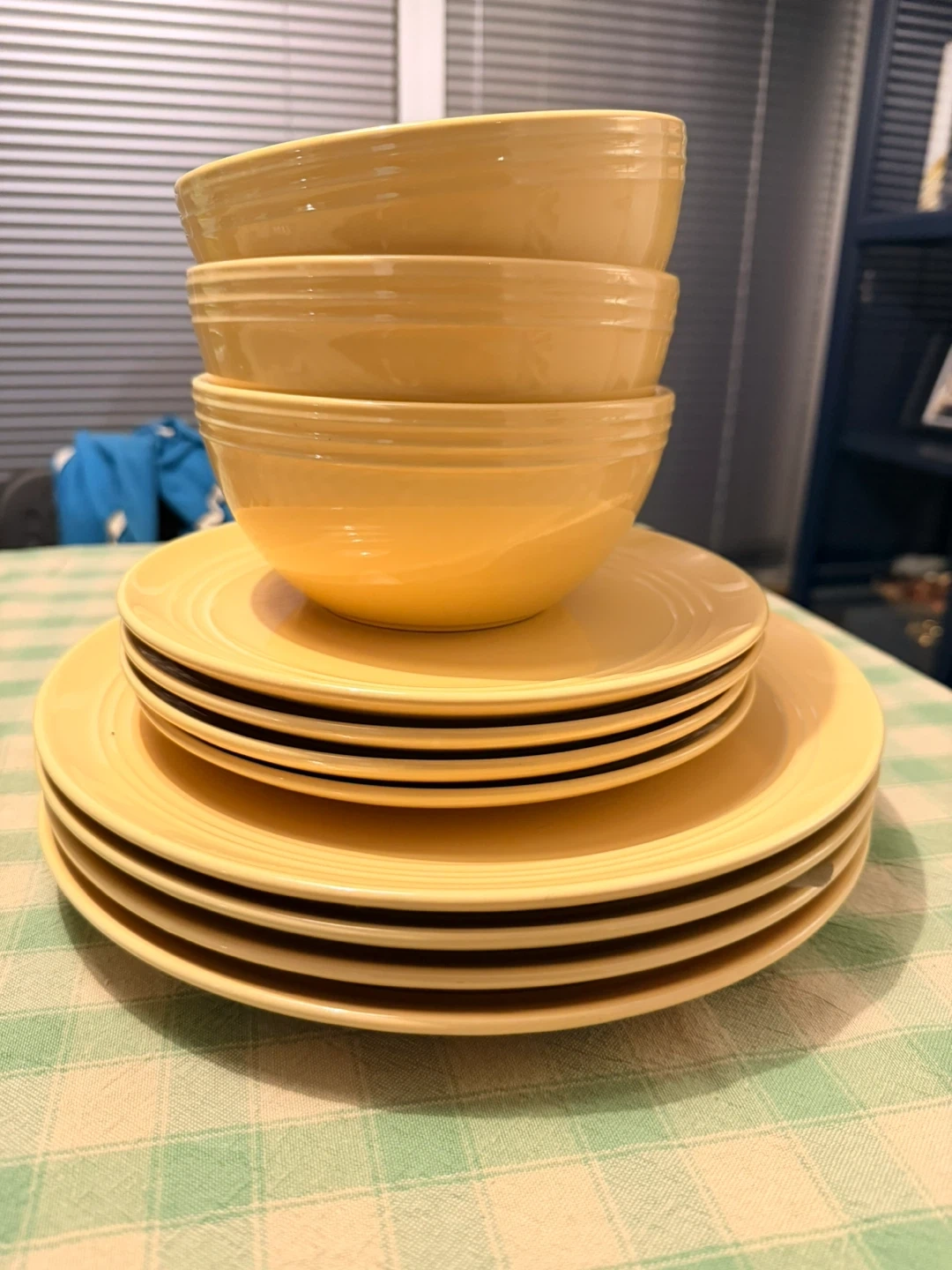 Selling a set of No Name dinner set in a lovely yellow colour. Includes plates and bowls. Great for adding a pop of colour to your kitchen. Quite heavily used with visible chips.