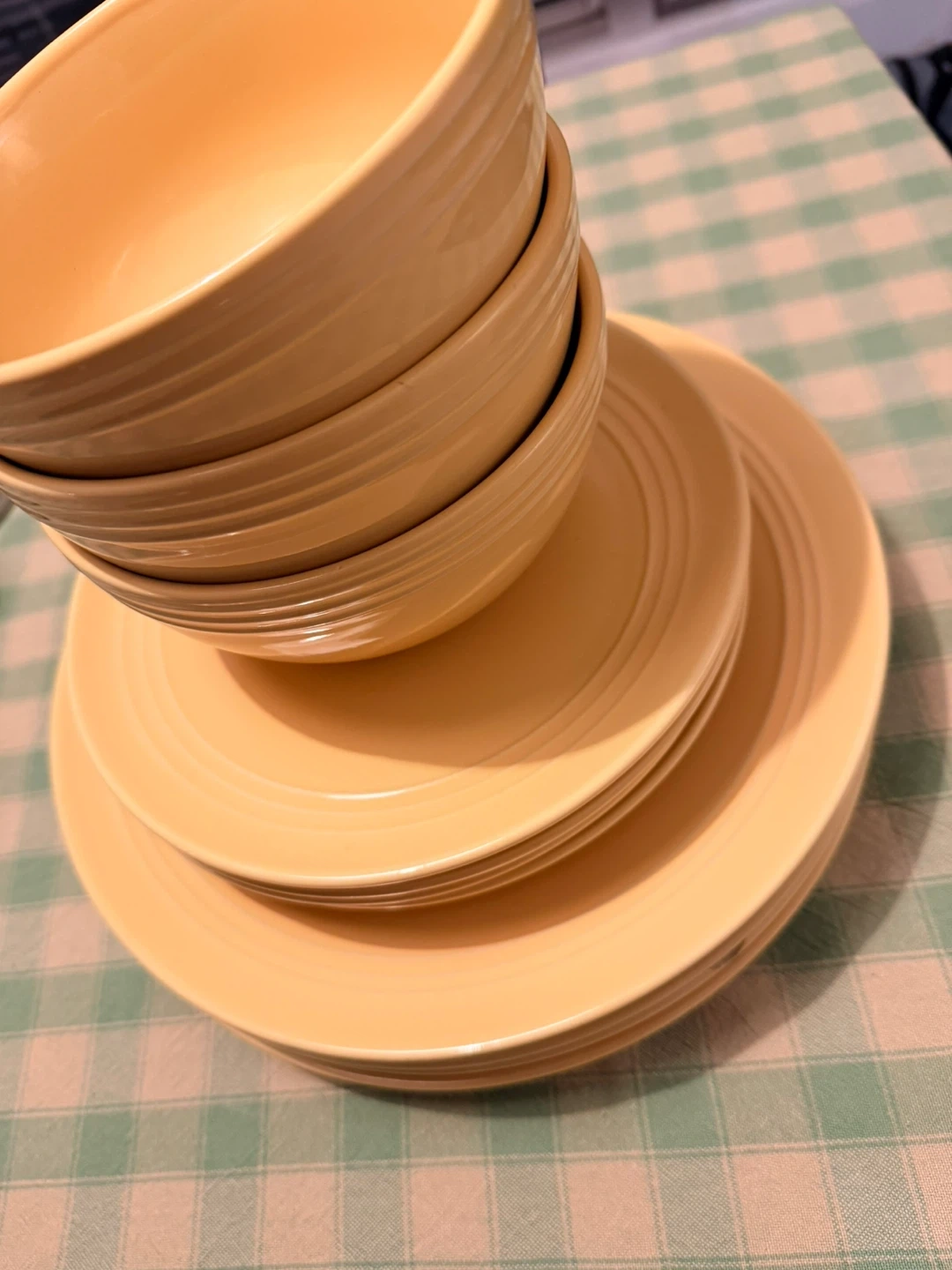 Selling a set of No Name dinner set in a lovely yellow colour. Includes plates and bowls. Great for adding a pop of colour to your kitchen. Quite heavily used with visible chips.