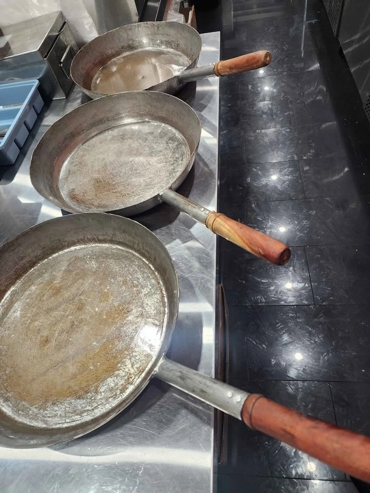 These are 3 pans we imported from India, but they are too big for our kitchen. All three are for $30. Each pan is $15. These pans are excellent for browning, searing, and grilling.