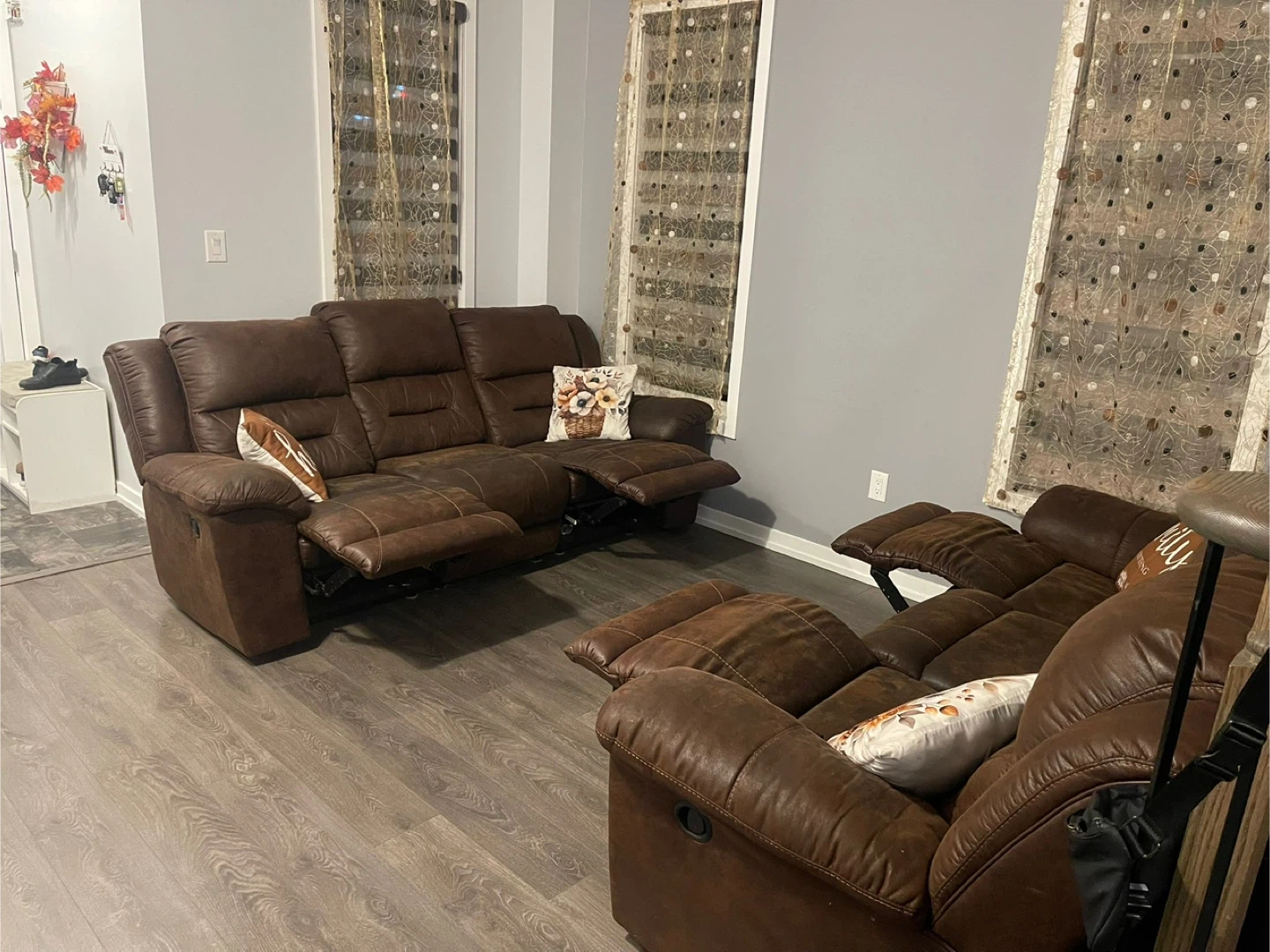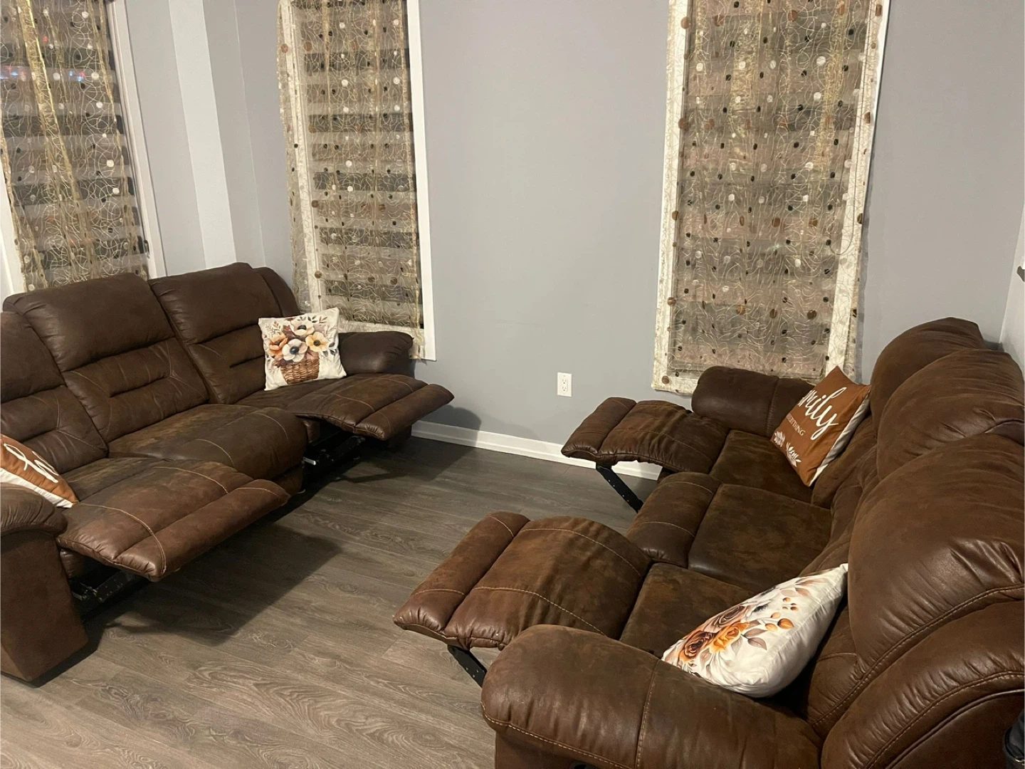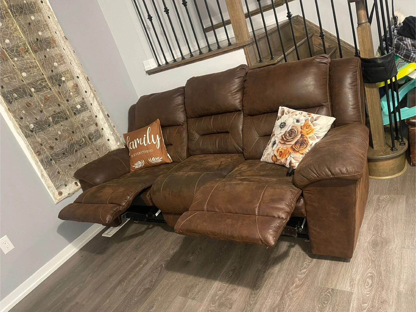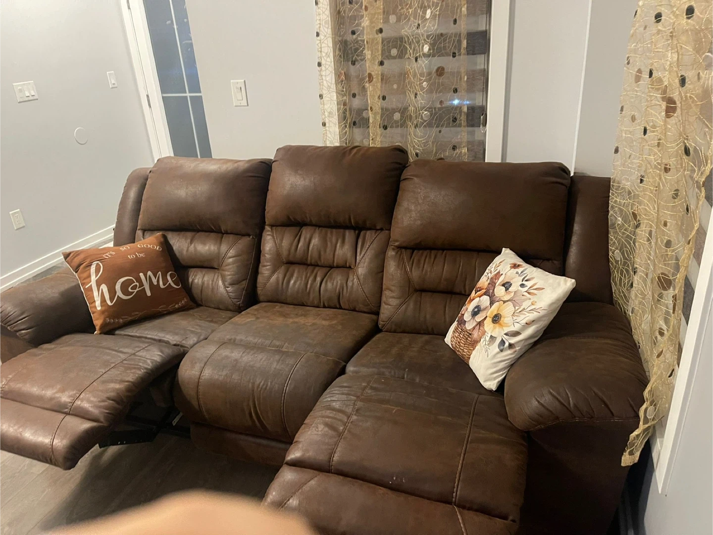 Selling a comfy brown leather reclining sofa. It's a great piece for any living room. There are some signs of use, but it's still in good condition and ready to provide lots of relaxation