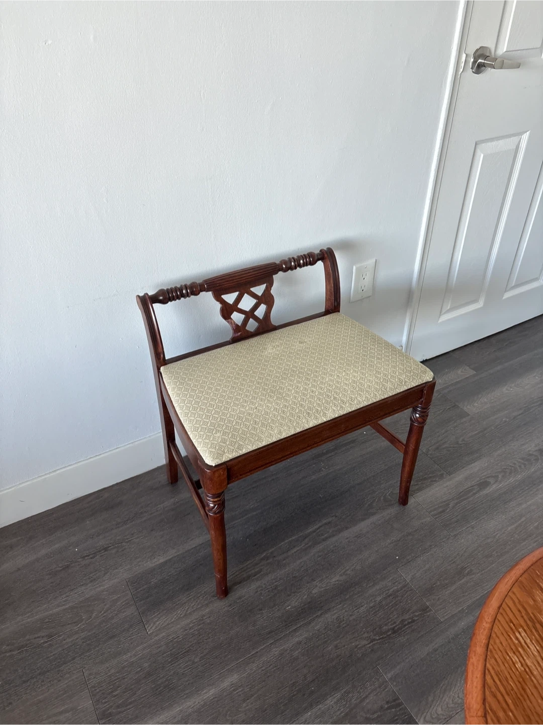 Here's a lovely upholstered bench seat! It's in great condition and would look great in any room. The wood is a nice dark colour and the seat is a neutral colour with a nice pattern.