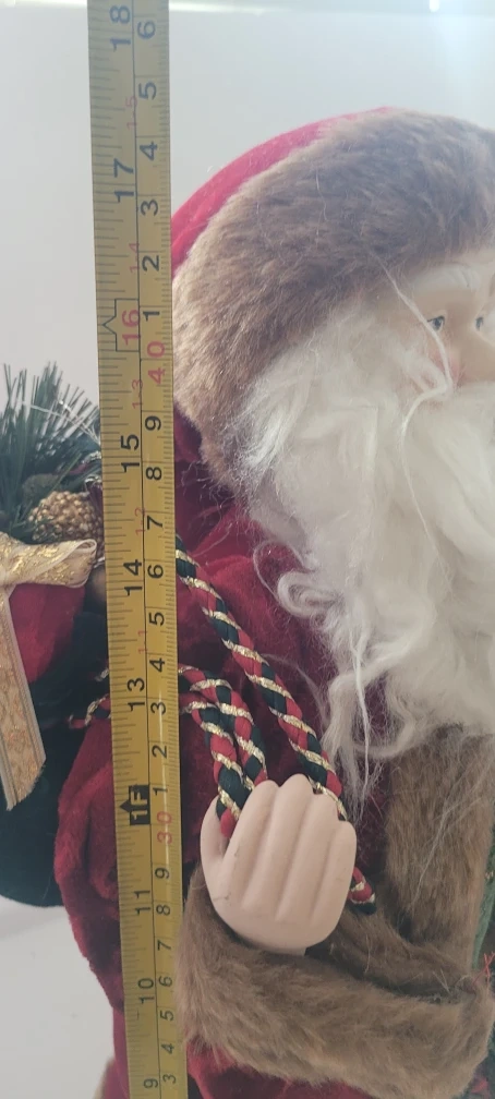 This is a Santa Claus figurine, perfect for holiday decor! It is approximately 18 inches tall. It features a red coat with fur trim and a green vest. Great for adding a festive touch to your home!
