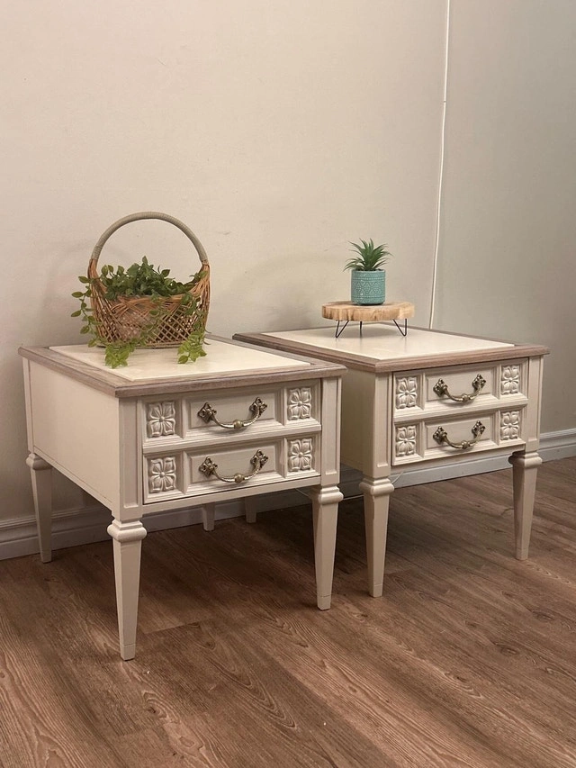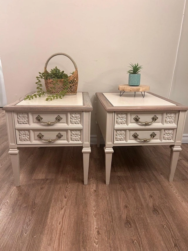 For sale is a beautiful set of two matching nightstands/end tables. They have been refurbished with a lovely soft cream/off-twhite finish and a light wood-tone top and trim. Each nightstand features one functional drawer with ornate carved fronts and original brass-tone hardware, providing great storage. These are perfect as bedside tables or as side tables for your living room. Dimensions (Approximate): • Height: 54.5 cm • Width: 51 cm • Depth: 66.5 cm Price is for the pair. For Sale By: Owner