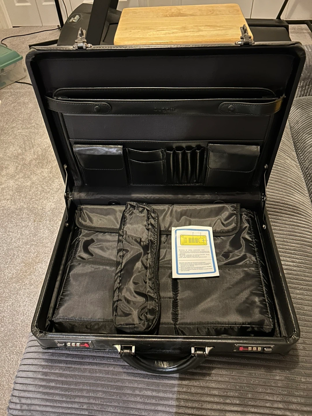 BRAND NEW NEVER USED Bugatti brief case!! Locks have never been set and original red key ties are still in the locks, measures 18”w x 13” tall x 4” deep. Dual 3 digit code locks safely secure your valuables, multiple inside storage compartments will keep your documents organized and easy to find. Asking $60 or BO.