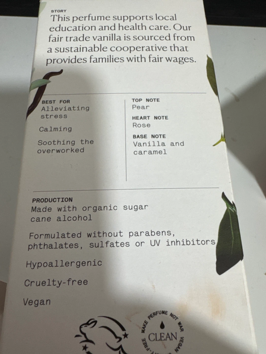 It's made with sustainably sourced organic fair trade vanilla oil from Madagascar. It has notes of pear, rose, vanilla, and caramel. It's also hypoallergenic, cruelty-free, and vegan
