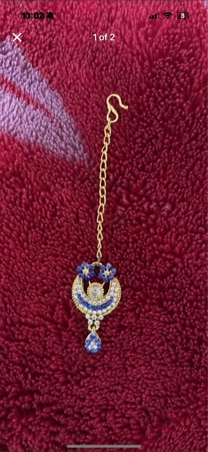 Beautiful Indian tikka headpiece with blue and gold detailing. Perfect for adding a touch of elegance to any outfit!