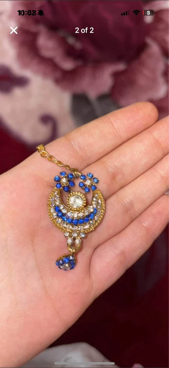 Beautiful Indian tikka headpiece with blue and gold detailing. Perfect for adding a touch of elegance to any outfit!