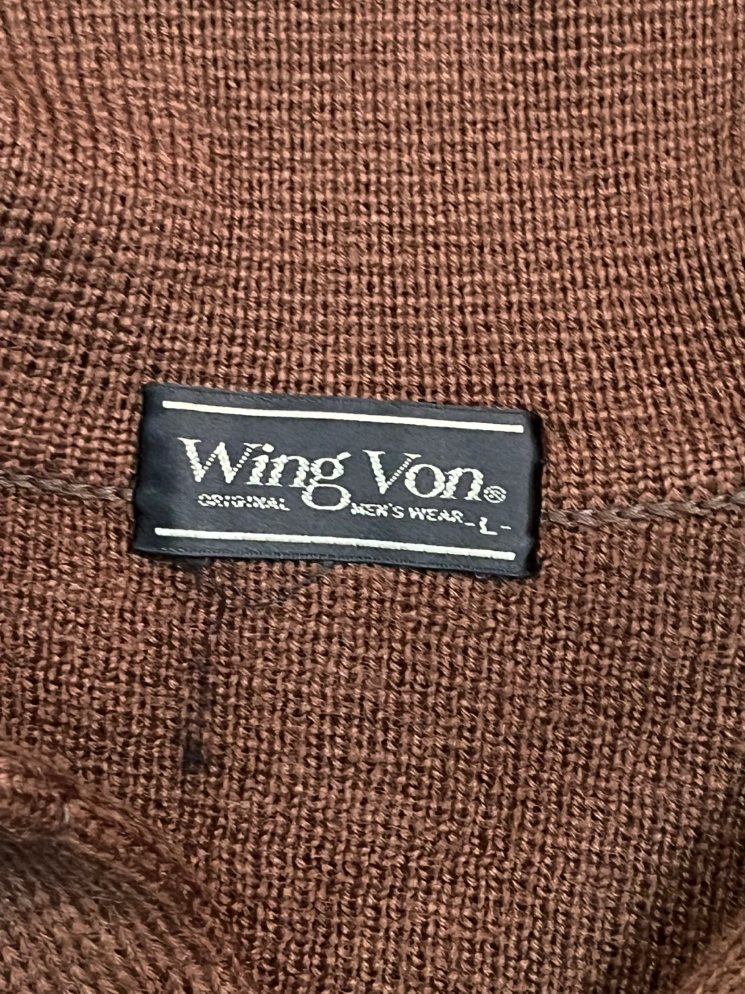 Selling a Wing Von brown jacket in size L. It's in great condition and ready for a new owner! The jacket features a button-up design with a mix of suede and knit materials.