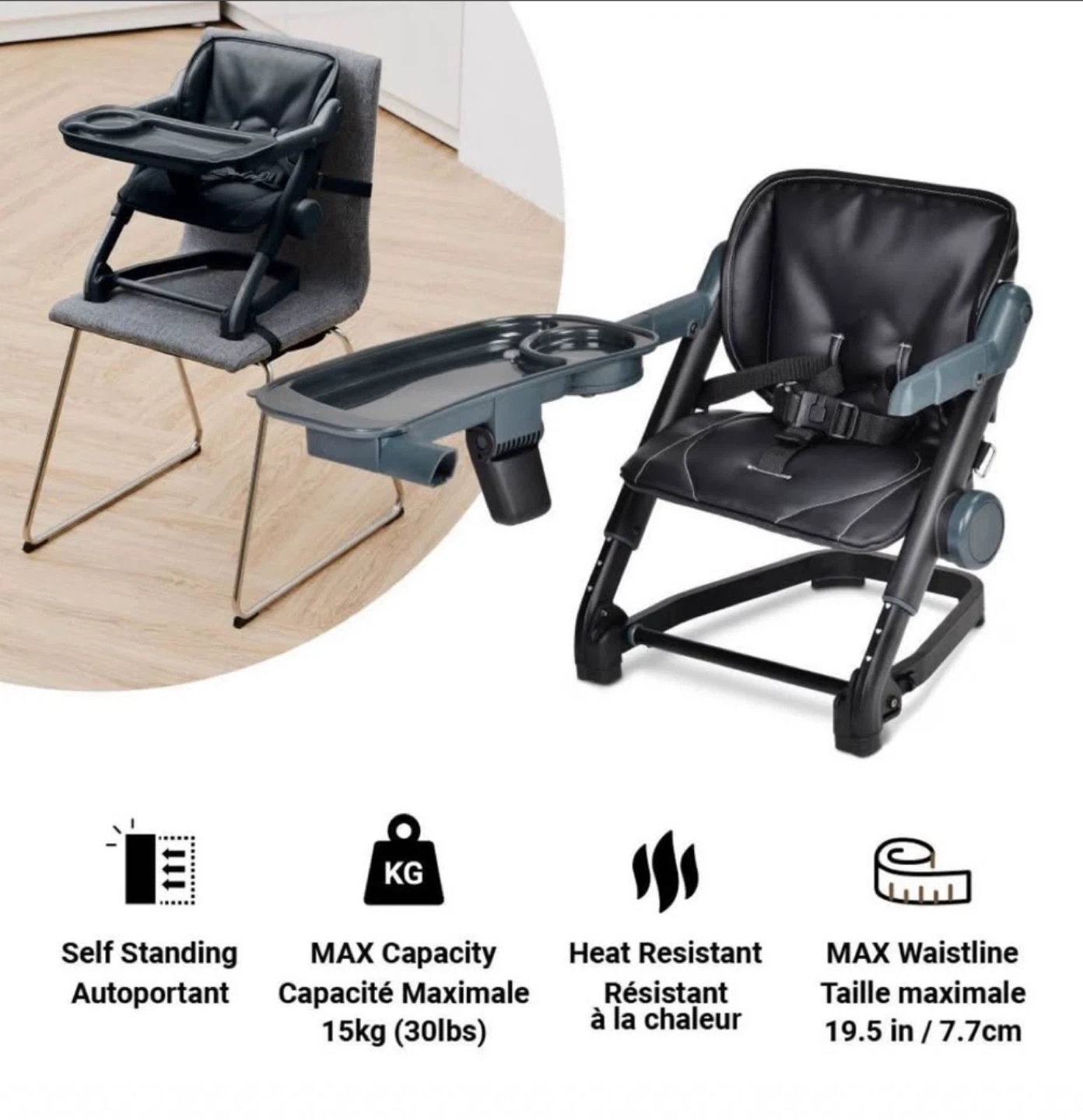 I'm selling a Voltz Toys Unilove Feed Me 3-in-1 Dining Booster in black! This dining booster is designed to be self-standing and heat resistant. It has a maximum capacity of 15kg (30lbs). The maximum waistline is 19.5 inches / 7.7cm. Originally bought for $149.99 at TJ kids.