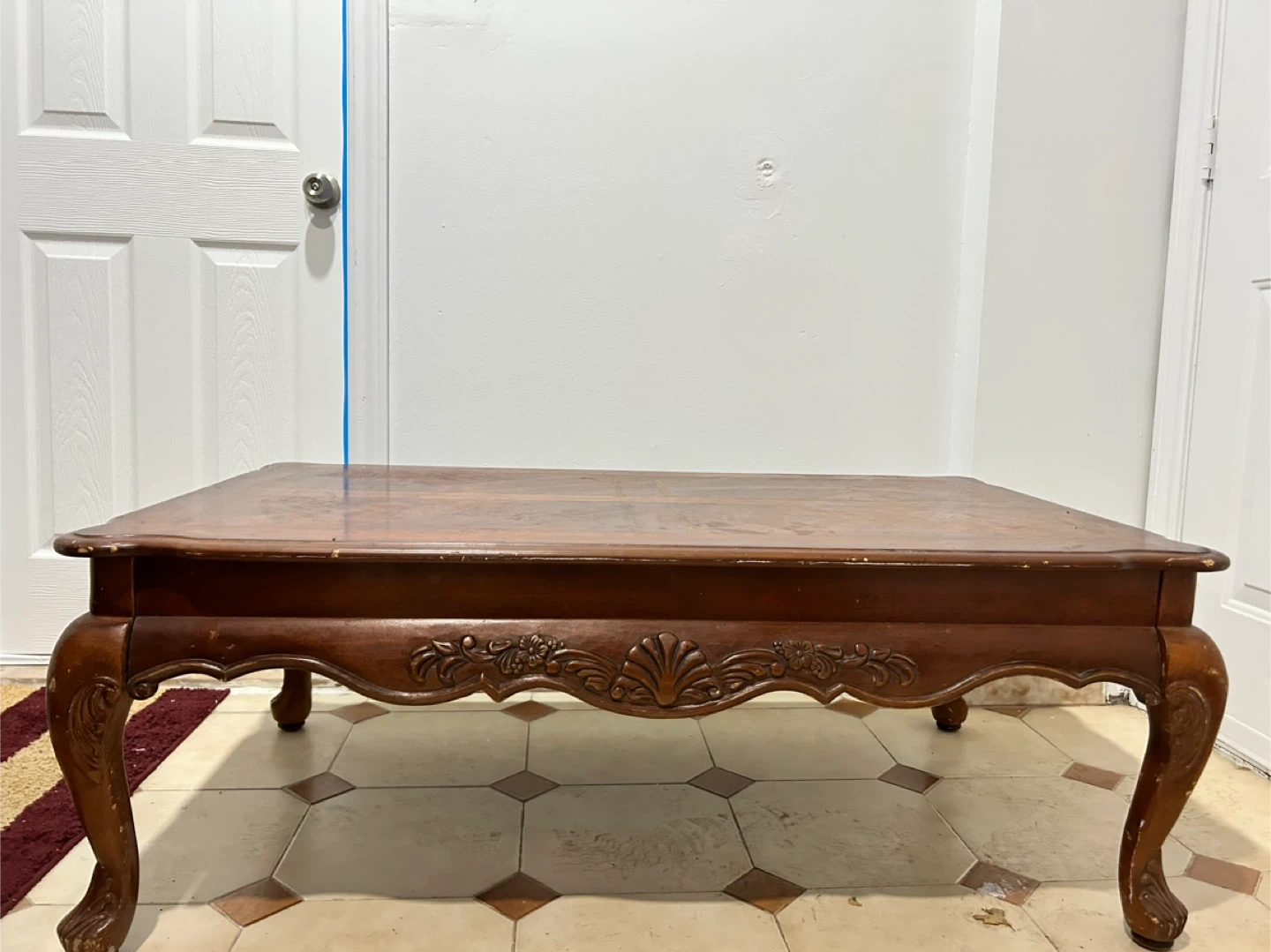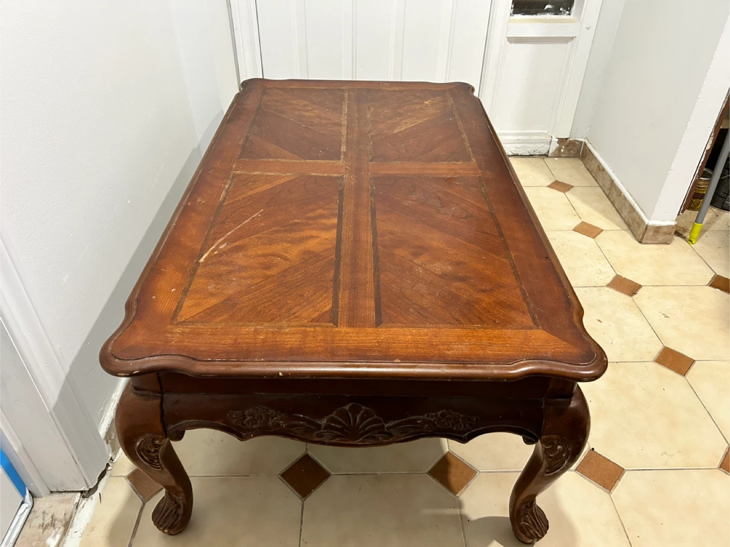 Selling a vintage wooden coffee table. It has a beautiful, classic design with ornate detailing on the legs and sides. The tabletop features a unique wood grain pattern. It's a sturdy piece that would add character to any living room. There are some signs of wear and tear, as shown in the photos, but it's still in good condition overall!