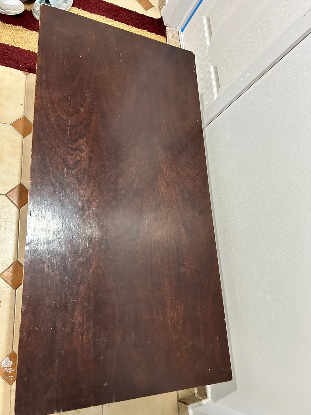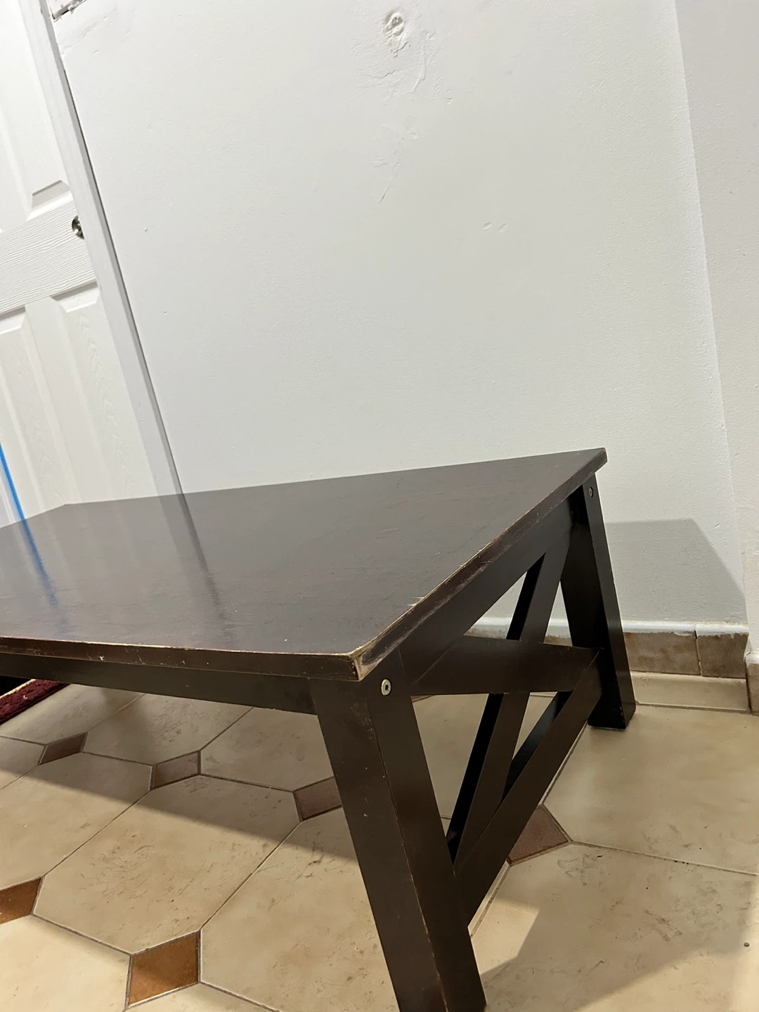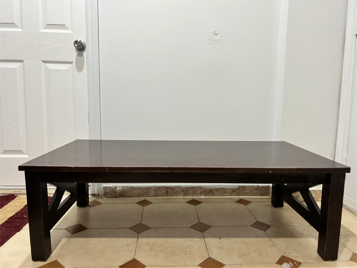 Selling a coffee table with a dark brown finish. It's got a simple, sturdy design with cross-braced legs. It's in good condition and ready to use in your living room!