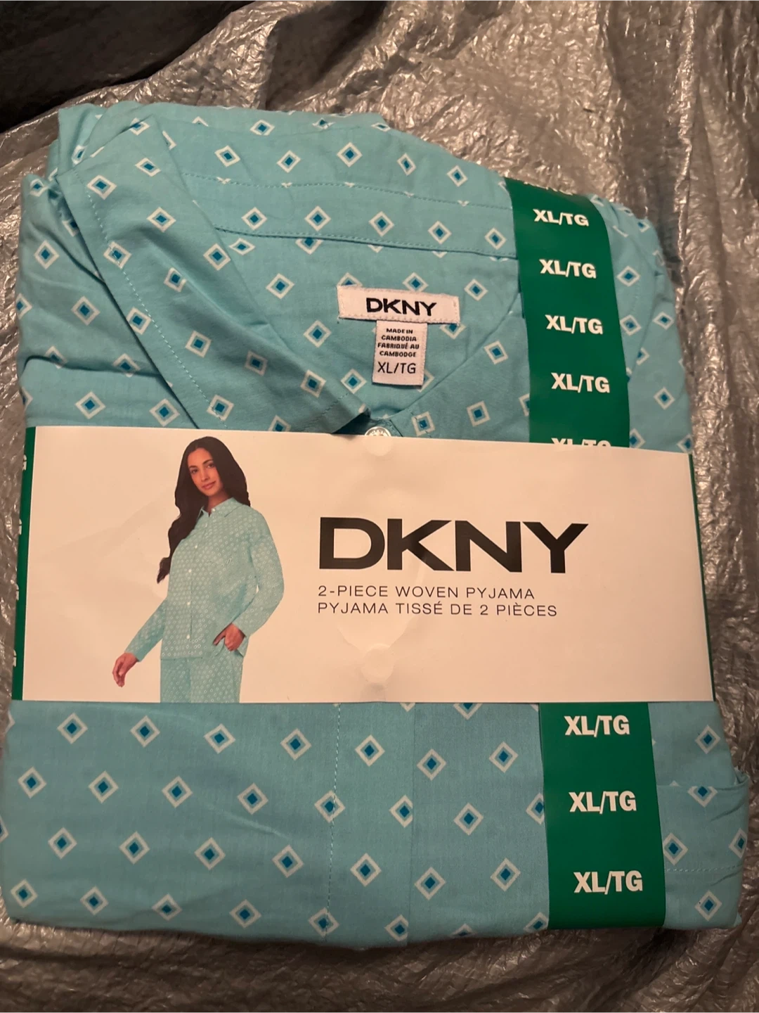 Here's a brand new DKNY 2-piece woven pyjama set in size XL. It's made of 55% cotton and 45% rayon/rayonné.