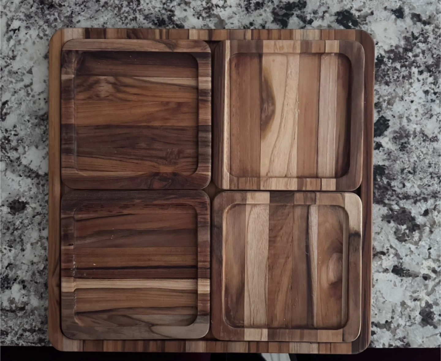 Selling a Teakhaus carving board, complete with trays! This beautiful board is made from teak wood, known for its durability and rich grain. It's perfect for carving meats or serving appetizers. The set includes four removable trays for easy serving and cleanup. A great addition to any kitchen!