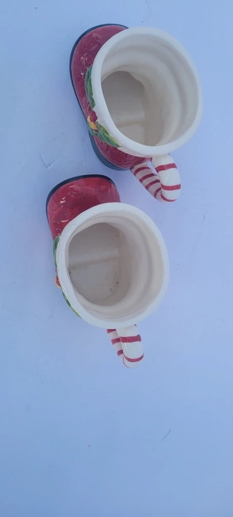 Selling a set of two adorable Christmas boot mugs! They feature a festive design with red boots, candy cane handles, and holly decorations. Perfect for adding a touch of holiday cheer to your morning coffee or hot cocoa