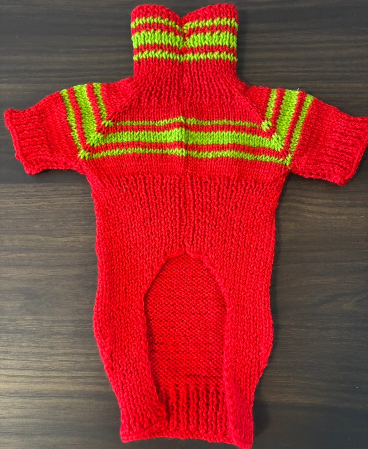 A cute and cozy handmade knitted dog sweater in red with green stripes! Perfect for keeping your furry friend warm during the colder months.