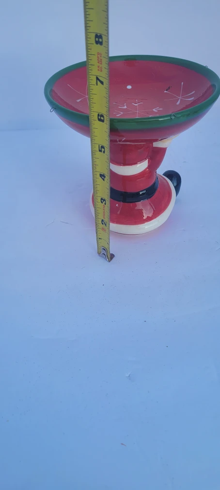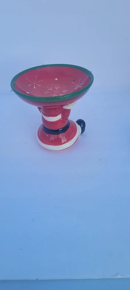 Selling a cute Santa candy dish! It's a festive way to hold your favorite treats during the holidays. The dish is red with snowflake designs, and Santa is wearing his classic suit. It measures approximately 8 inches tall.